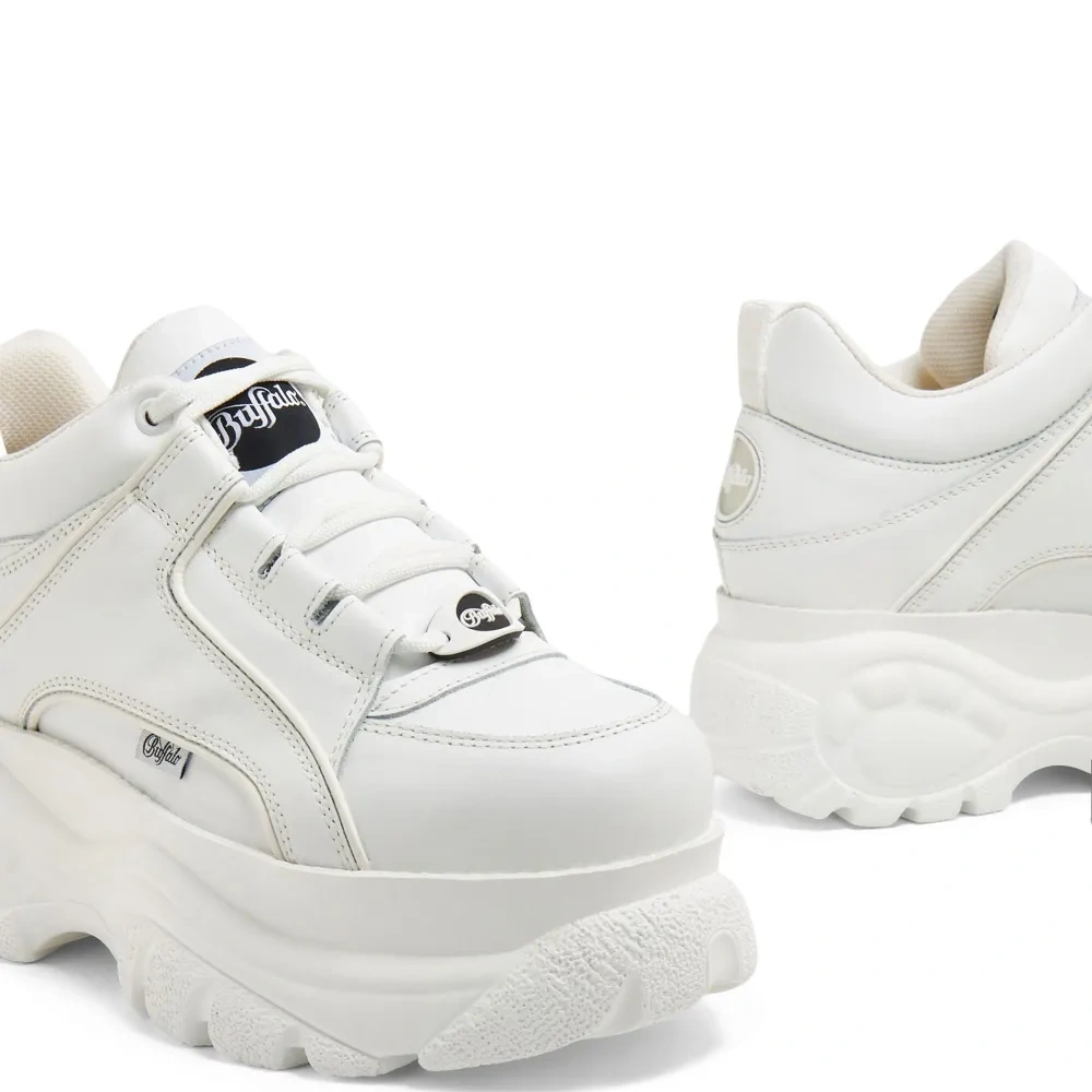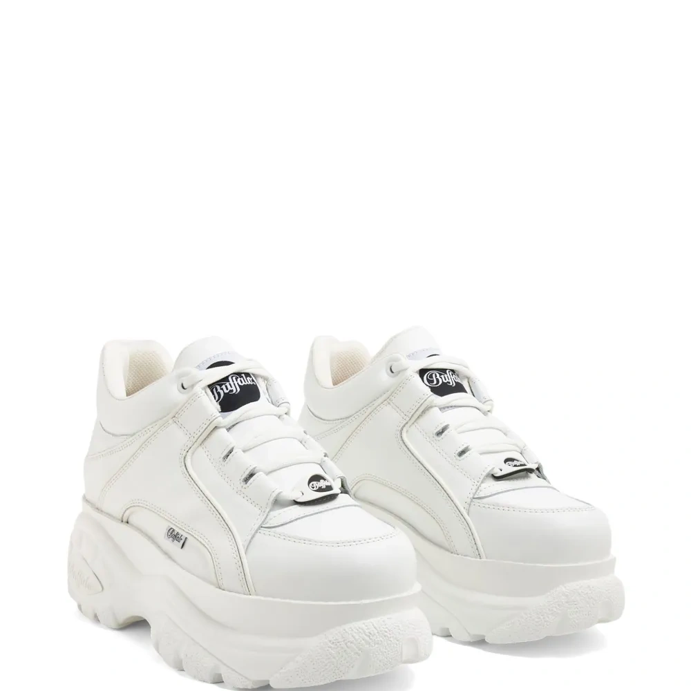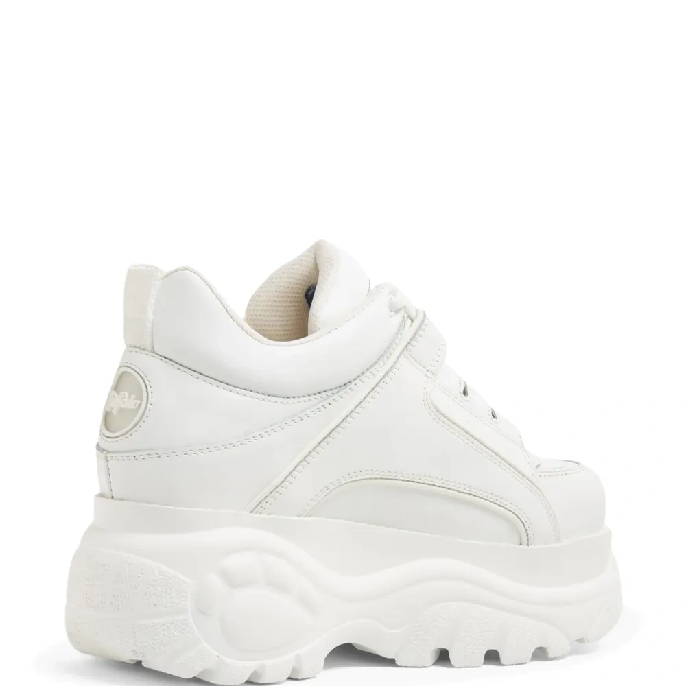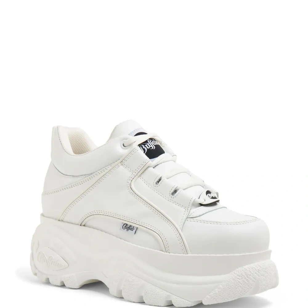 Белый, кожа, лакированная отделка, нашивка с логотипом на язычке, вставки, петля для подтягивания сзади, шнуровка спереди и массивная резиновая подошва.