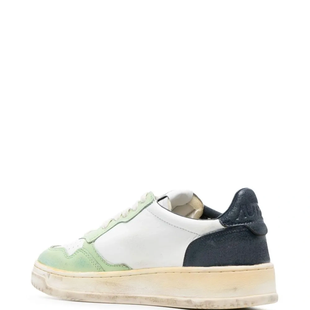 Белый, светло-зеленый, темно-синий, телячья кожа, нашивка с логотипом сбоку, перфорация, дизайн колор-блок, шнуровка спереди и плоская резиновая подошва.