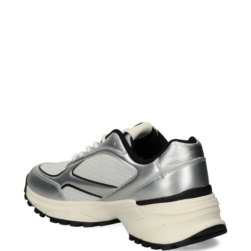 серебристо-белый, логотип, шнуровка, вставки из сетчатого материала, черная отделка, резиновая подошва