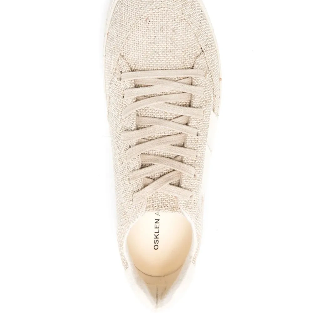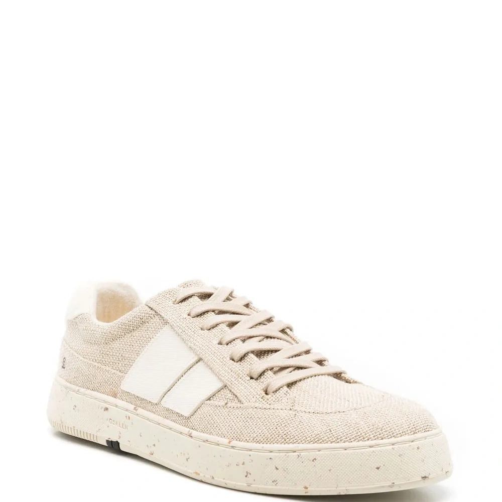 Бежевый, парусина, закругленный носок, шнуровка спереди, стелька с логотипом, контрастный задник, задник с логотипом и плоская резиновая подошва.