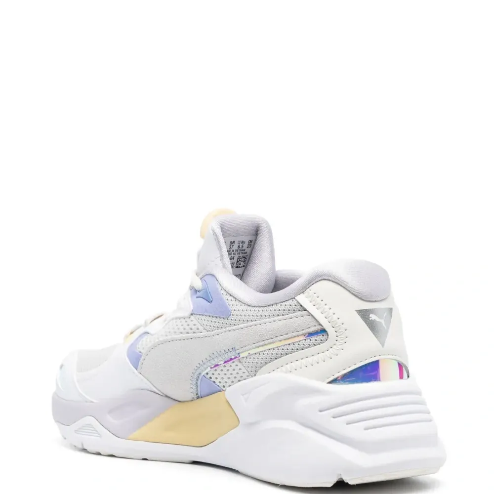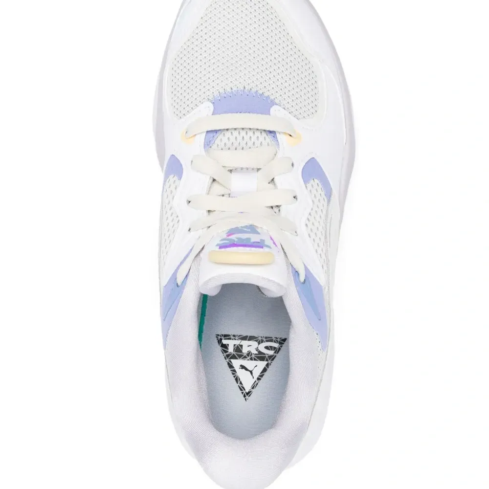 Белый/разноцветный, вставки, сетчатые вставки, принт с логотипом сзади, нашивка с логотипом на язычке, светоотражающие детали, миндалевидный носок, шнуровка спереди, стелька с логотипом и массивная резиновая подошва.