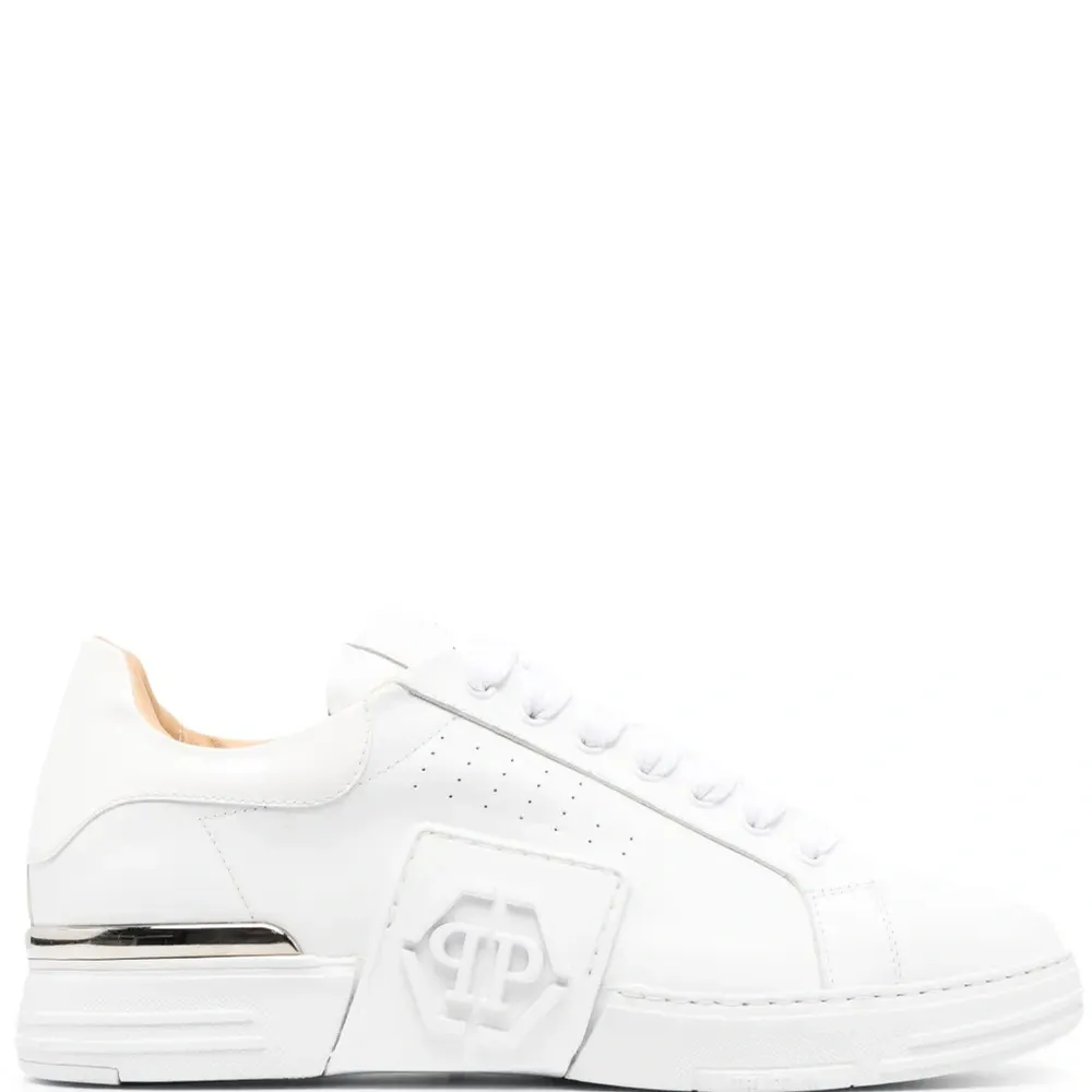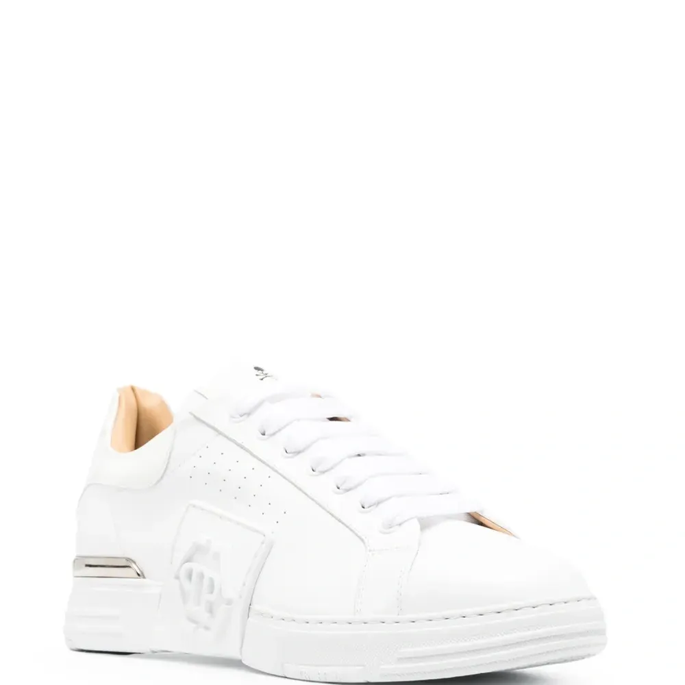 Белый, телячья кожа, тисненый логотип сбоку, язычок с логотипом, закругленный носок, шнуровка спереди, перфорация, стелька с логотипом и плоская подошва.