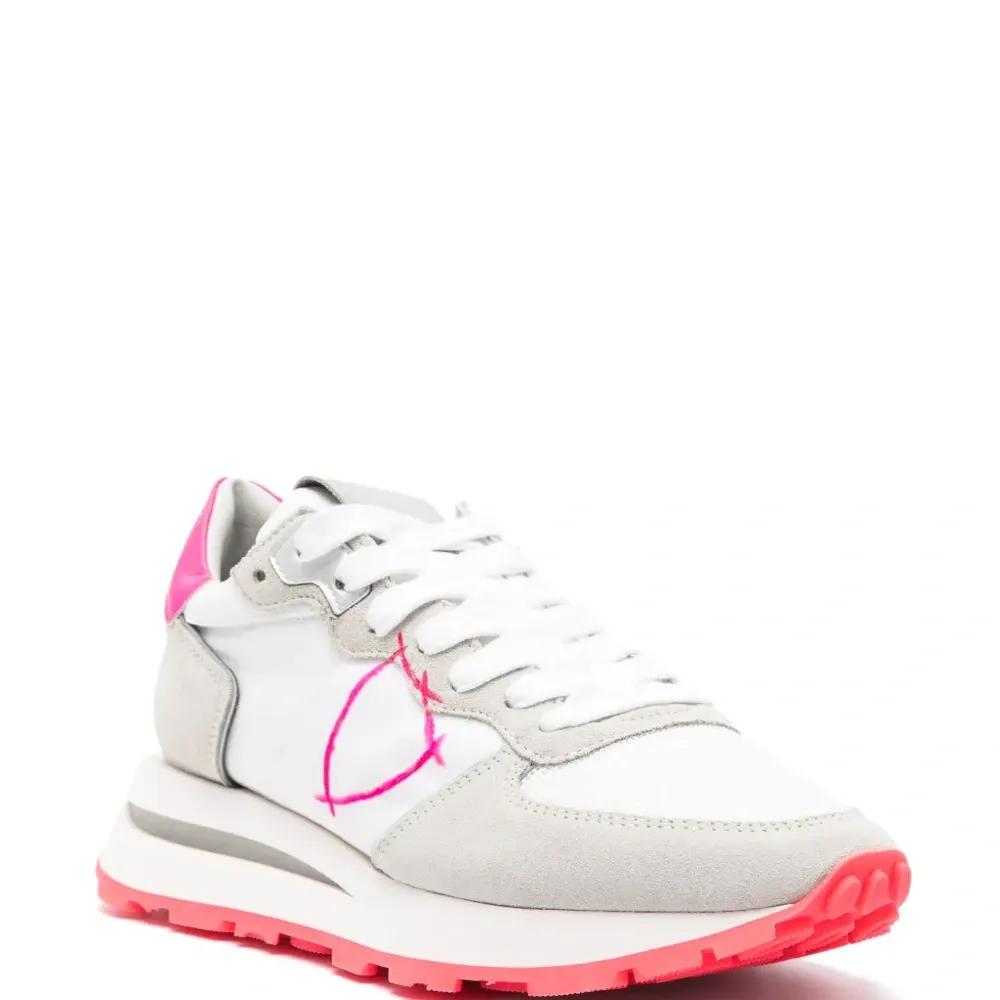 Фуксия, вставки, замшевые вставки, логотип сбоку, нашивка с логотипом на язычке, контрастный задник с логотипом, миндалевидный носок, шнуровка спереди, стелька с логотипом и массивная резиновая подошва.