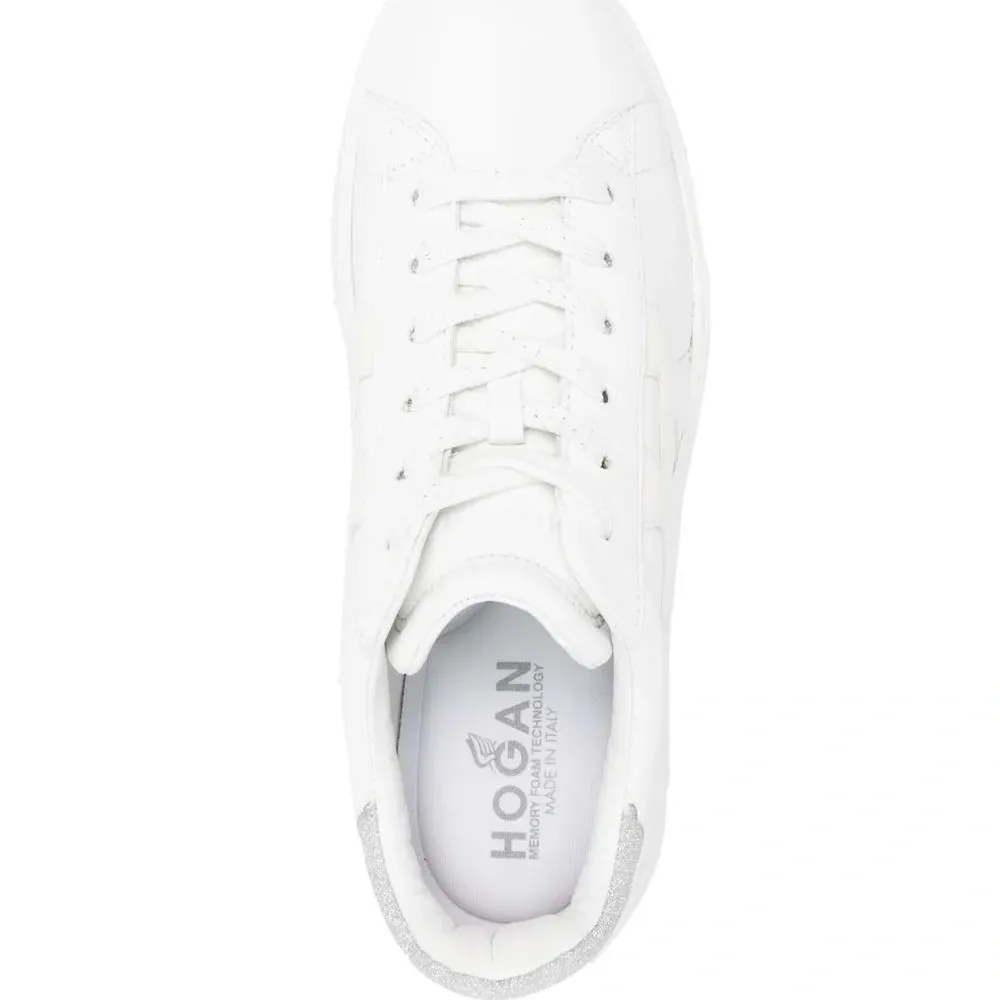 Белый, телячья кожа, нашивка с логотипом сбоку, люрекс, закругленный носок, шнуровка спереди, стелька с логотипом и подошва на платформе.