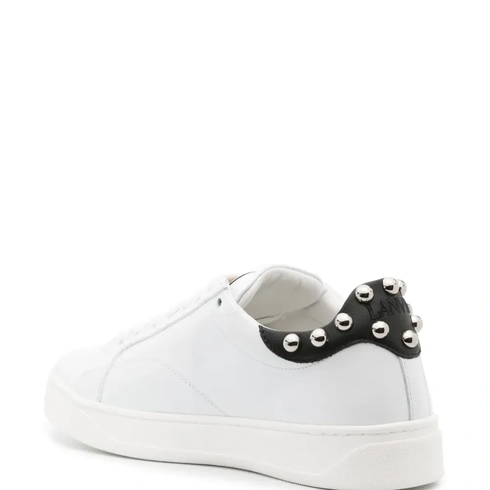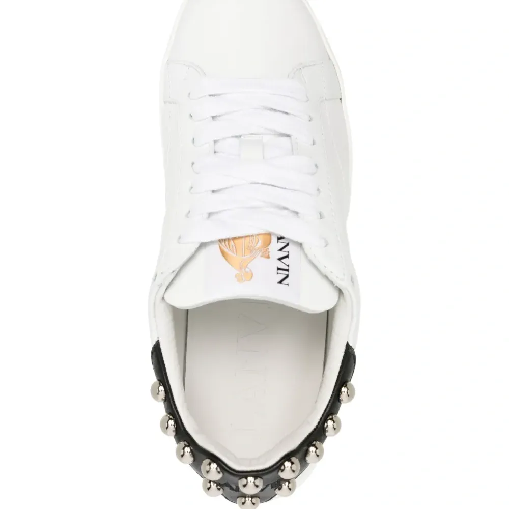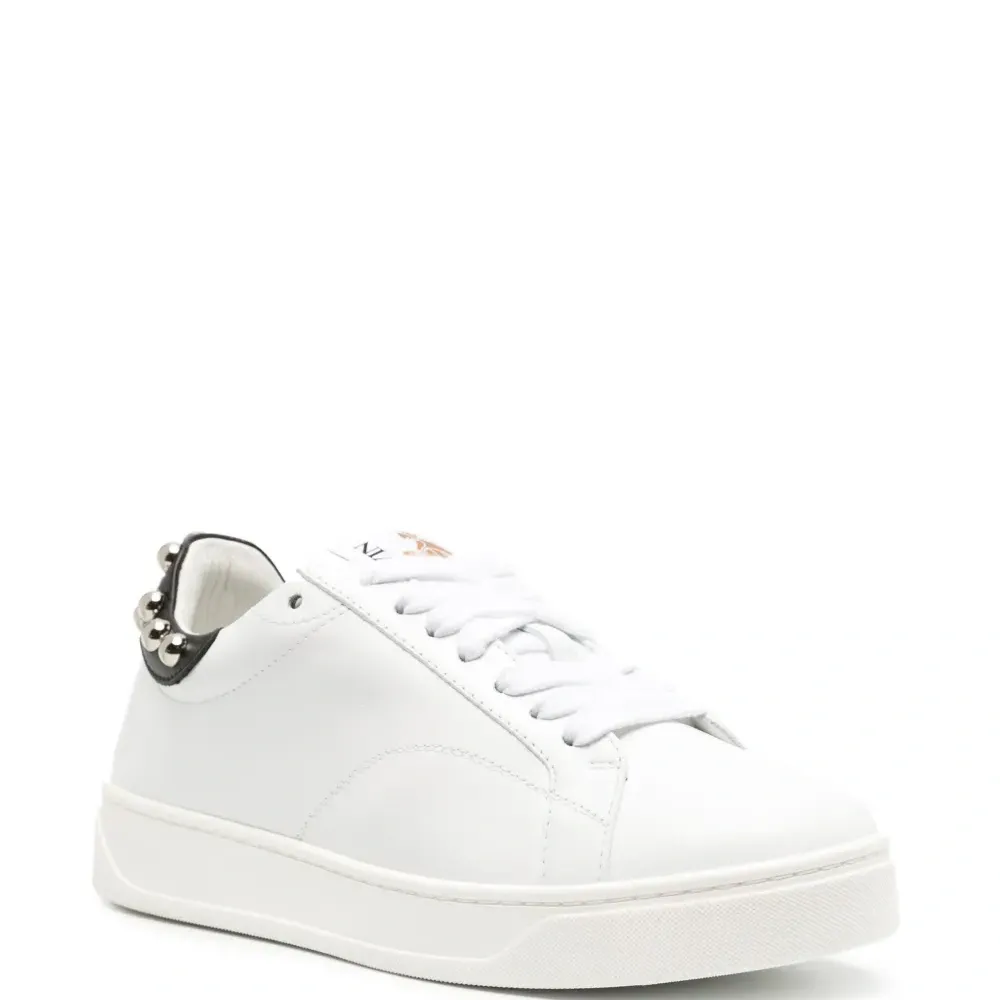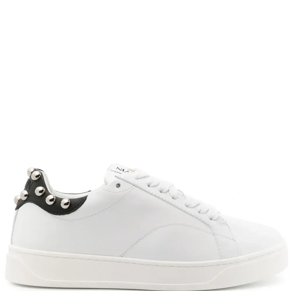 Белый/черный, телячья кожа, серебристые заклепки, закругленный носок, шнуровка спереди, нашивка с логотипом на язычке и резиновая подошва.