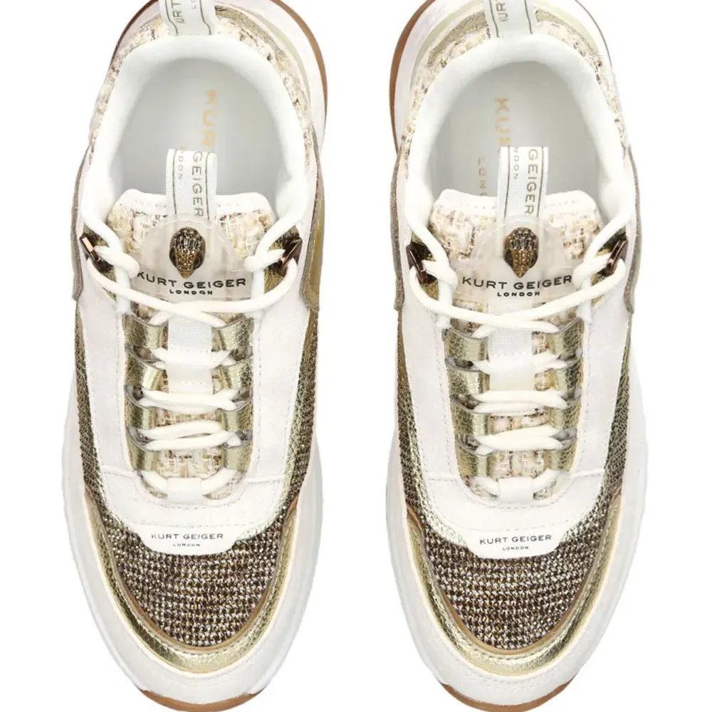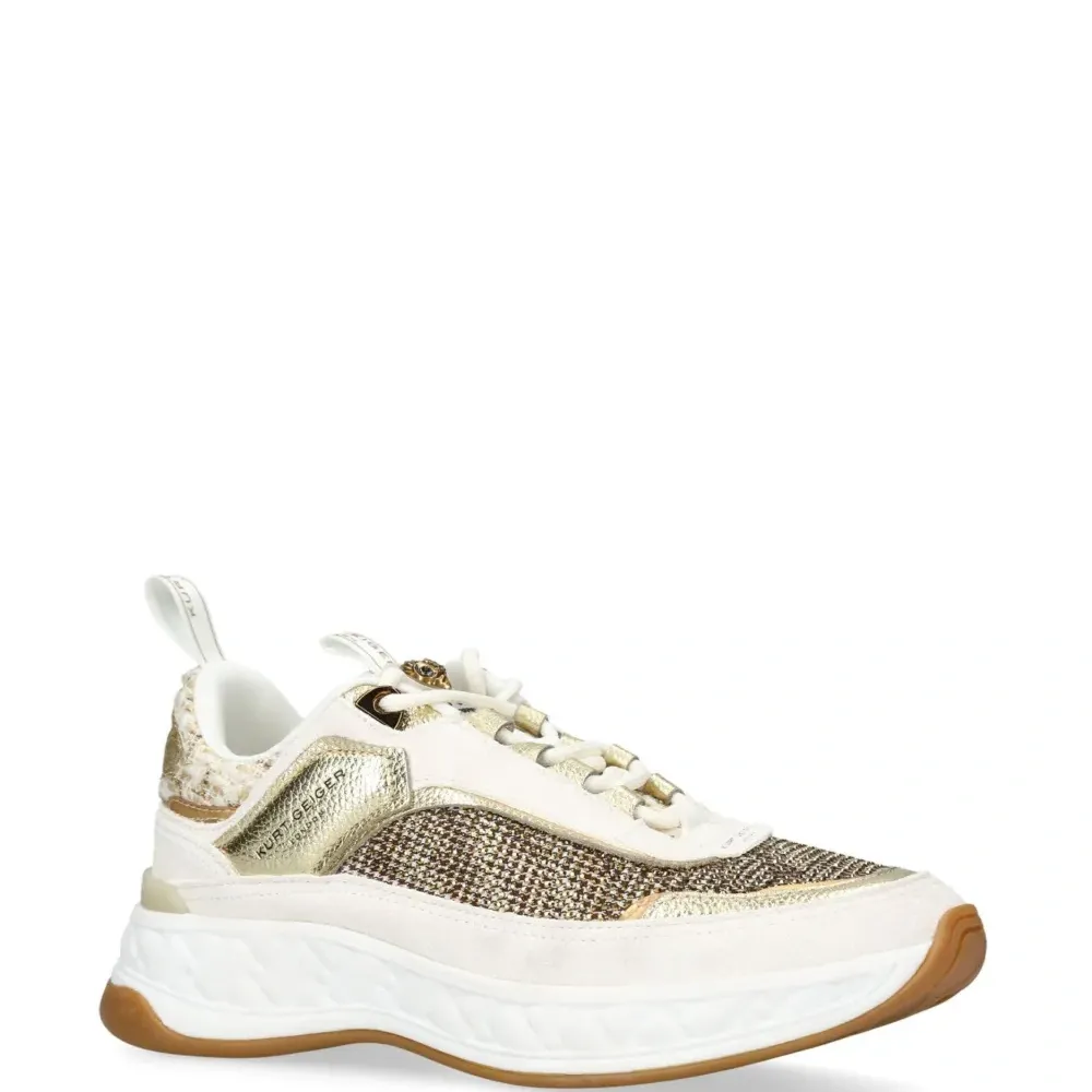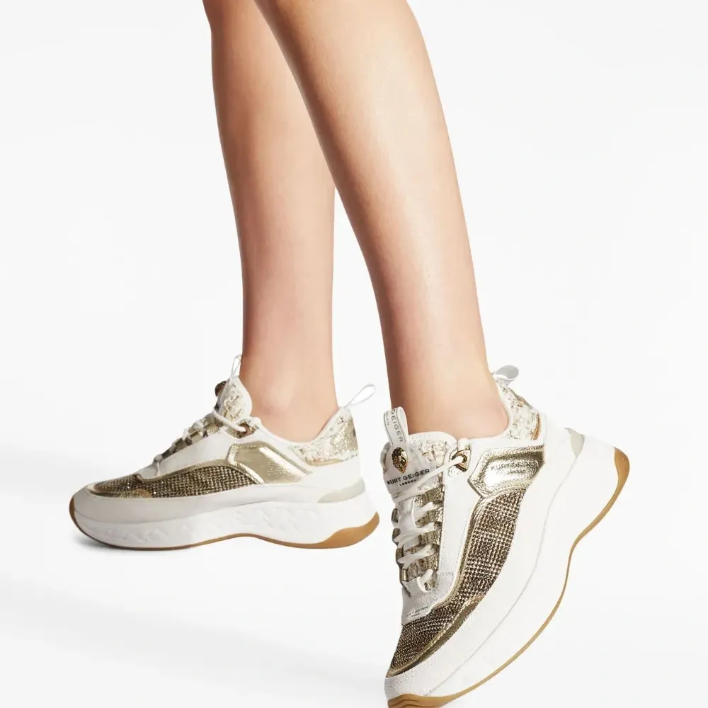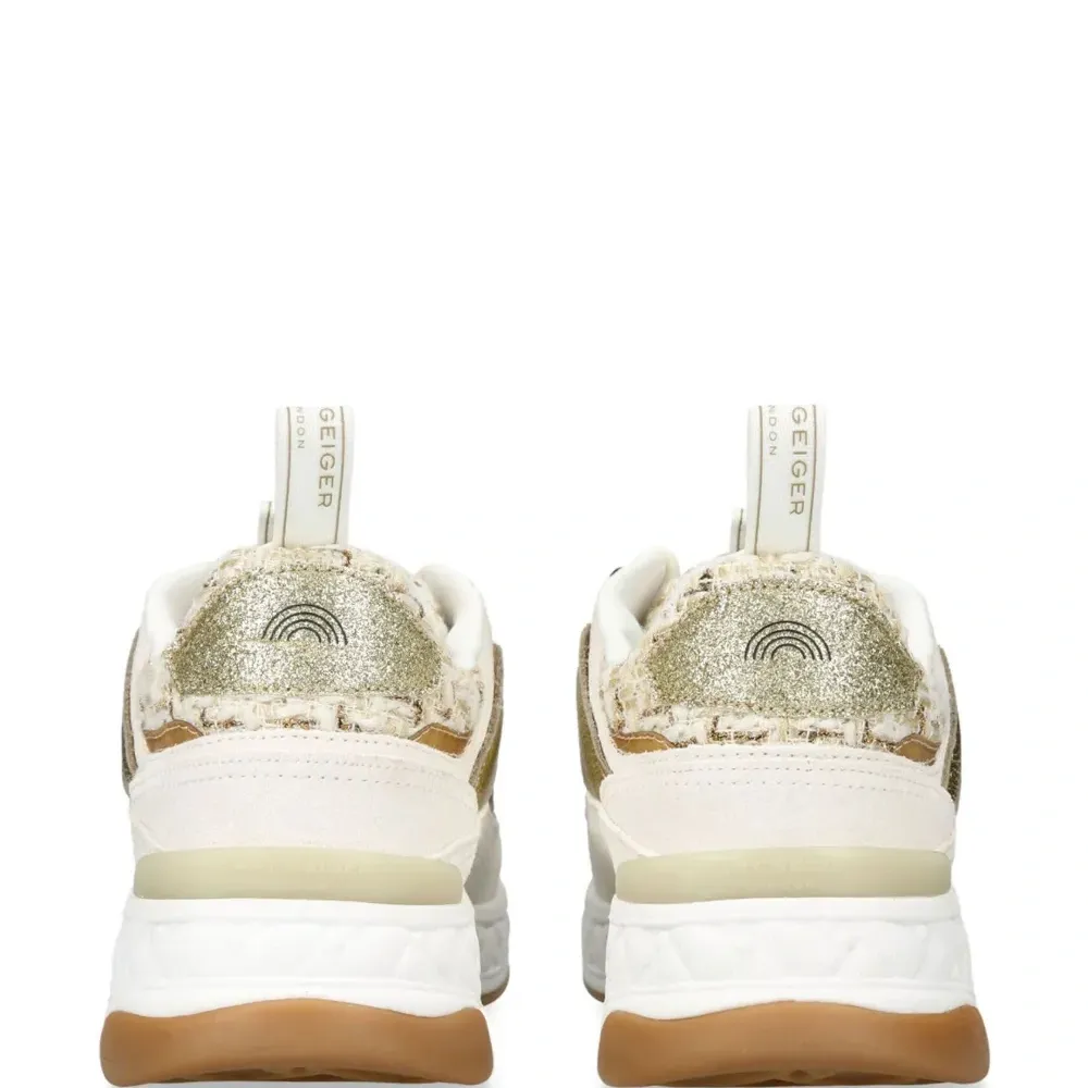 Бежевый, замша, эффект металлик, вставки, аппликация, тисненый логотип на язычке, тисненый логотип сбоку, принт с логотипом сзади, двойная петля для подтягивания, закругленный носок, шнуровка спереди и плоская резиновая подошва.