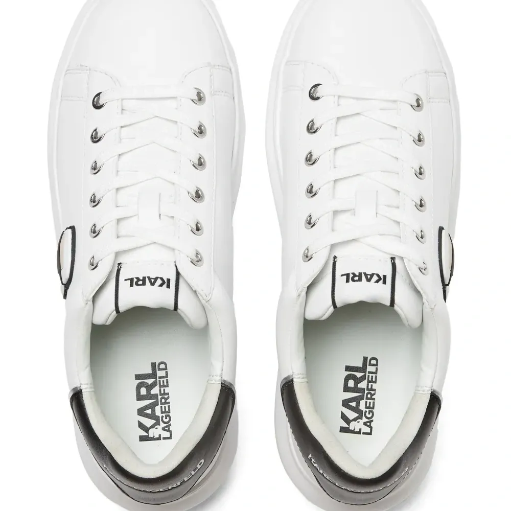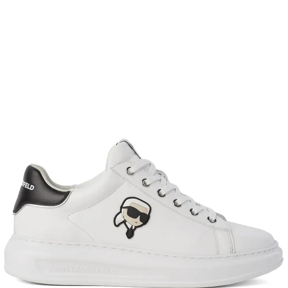 Белый, телячья кожа, знаковая нашивка Mini Ikonik Karl, нашивка с логотипом сбоку, нашивка с логотипом на язычке, шнуровка спереди, закругленный носок, стелька с логотипом, контрастный задник с логотипом и массивная резиновая подошва.