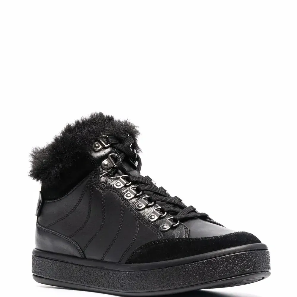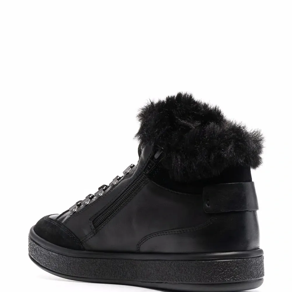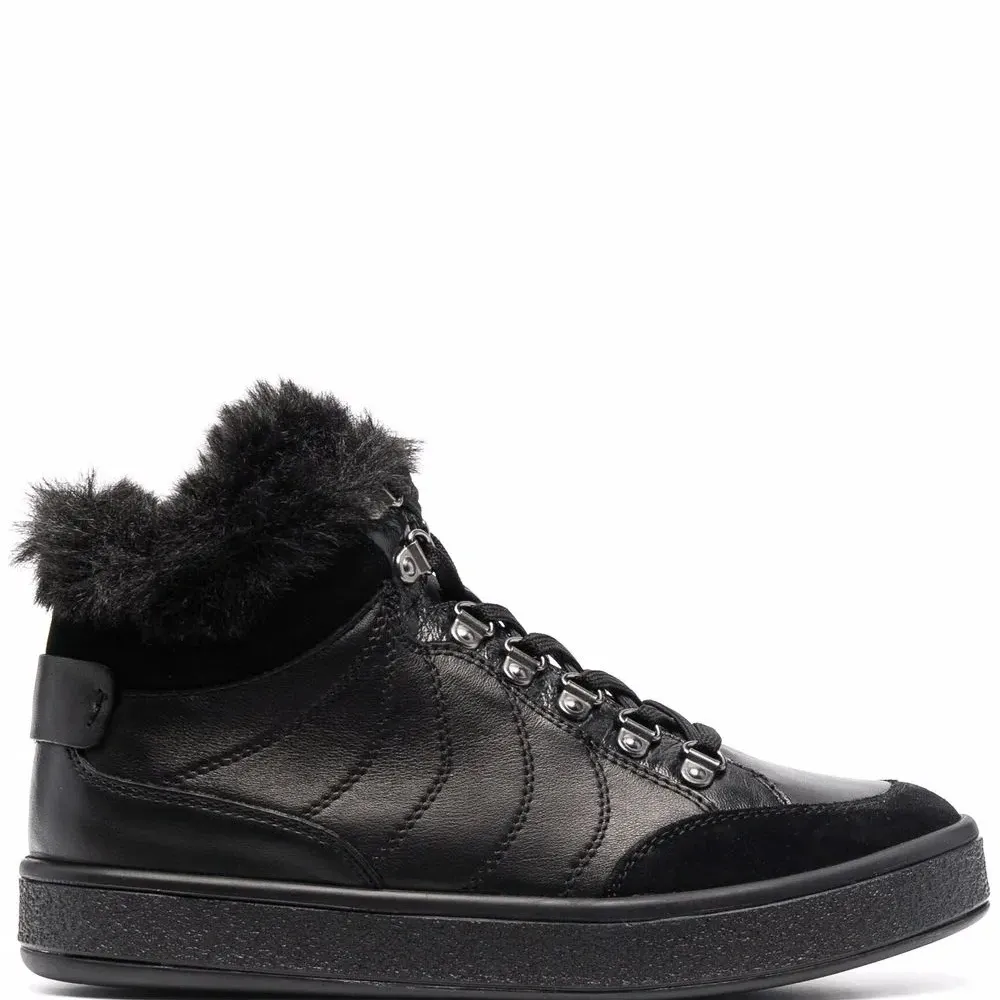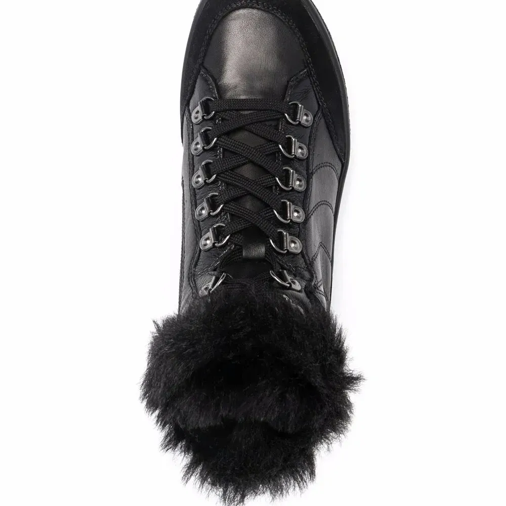 Меховая подкладка, отделка из меха, закругленный носок, шнуровка спереди и плоская резиновая подошва. Цвет: черный.