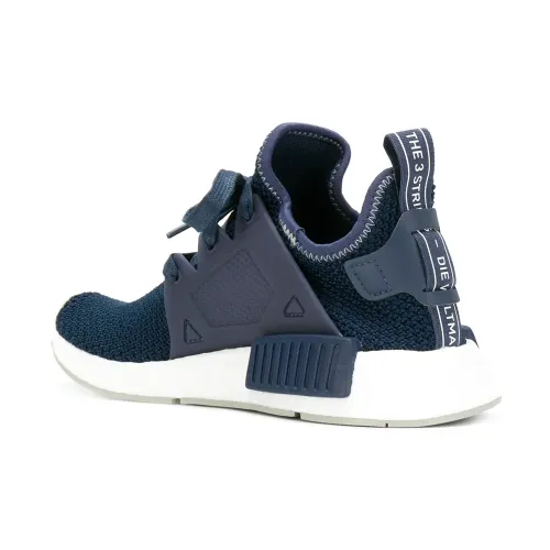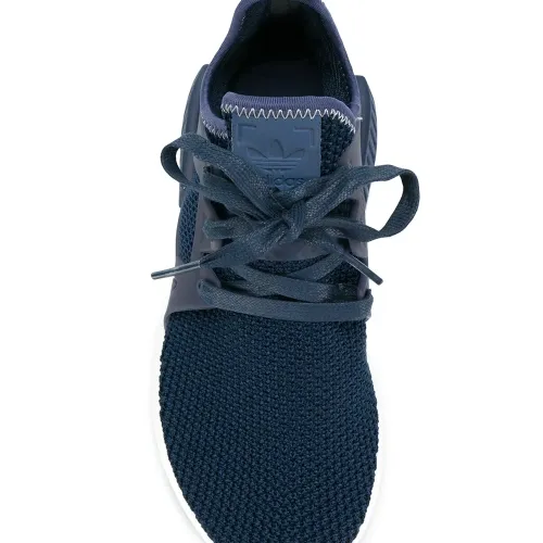 Синие хлопковые кроссовки 'NMD_XR1 W' от Adidas (Адидас). Округлый нос, шнуровка спереди, нашивка с тисненым логотипом бренда на язычке, трикотажный верх, прочные каркасные вставки по бокам, нашивка с логотипами бренда сзади на пятке, белая резиновая подошва.