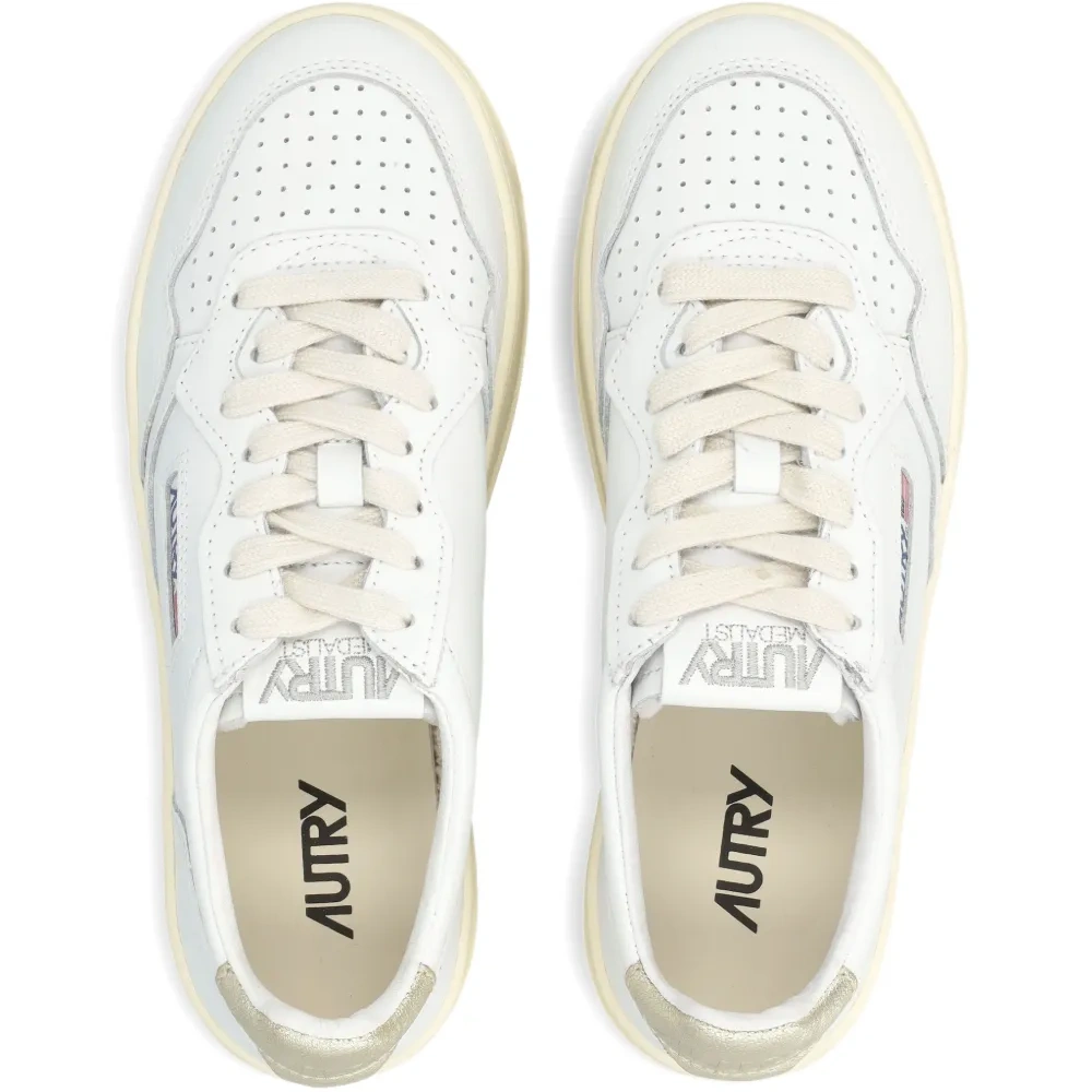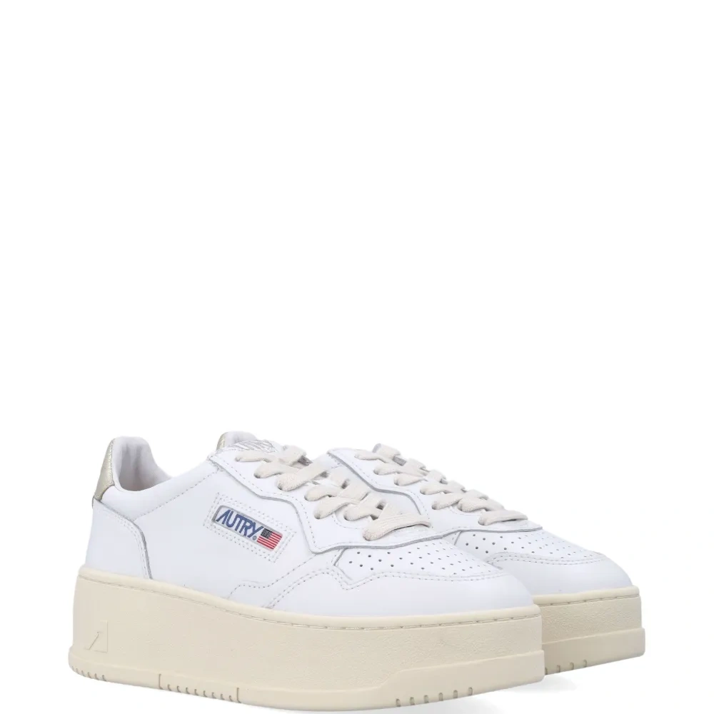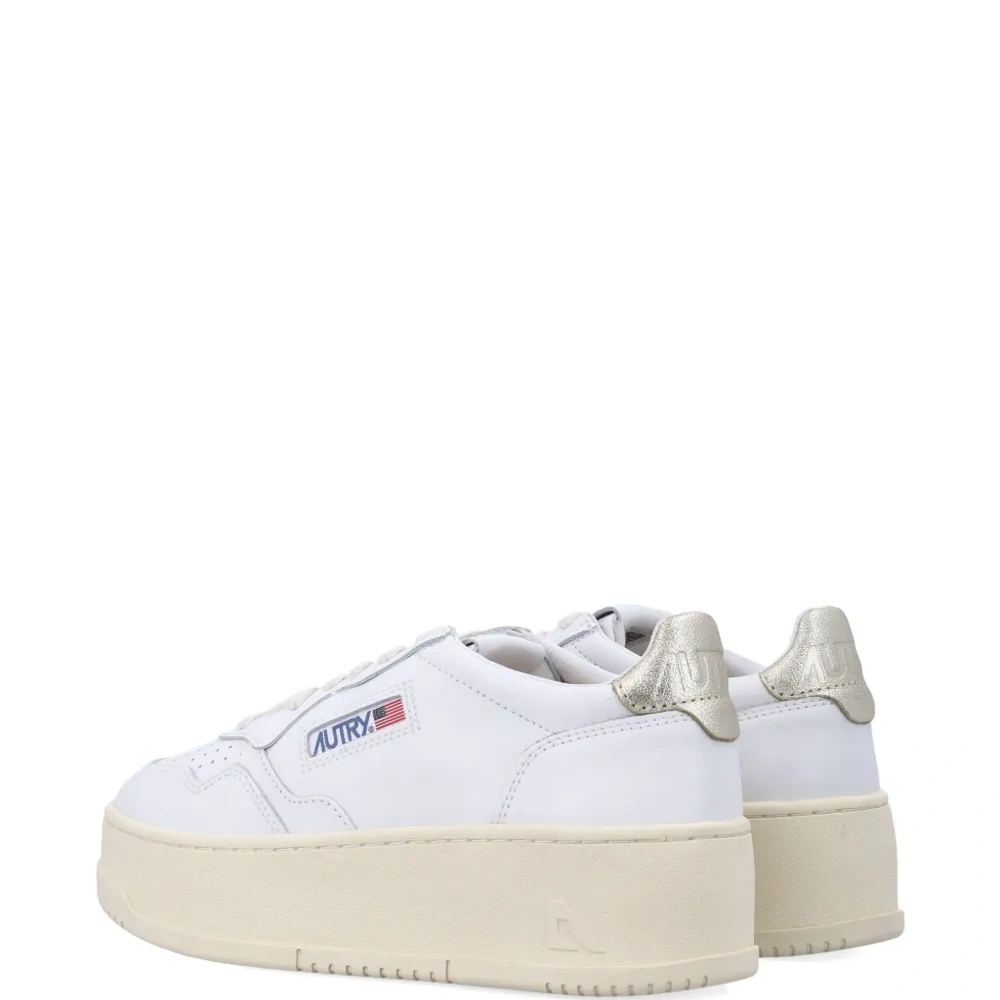 белая кожаная обувь на платформе, пятка с золотистым акцентом, нашивка с логотипом