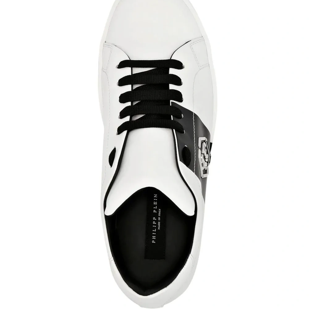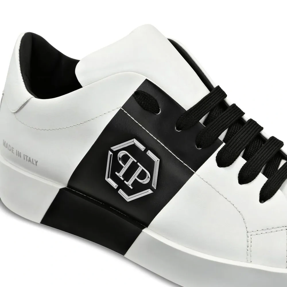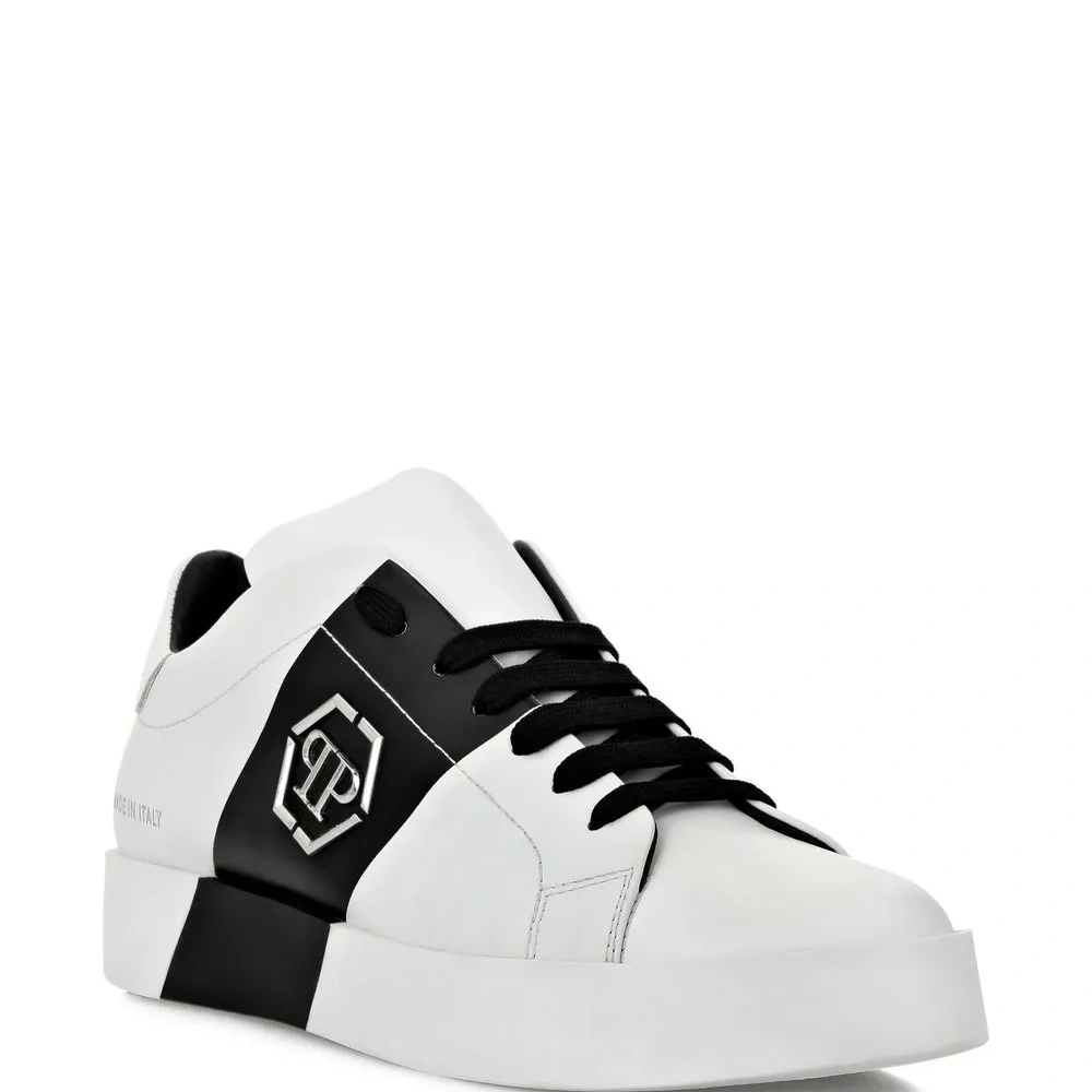 Черный/белый, телячья кожа, металлический логотип, шнуровка спереди, закругленный носок и плоская резиновая подошва.