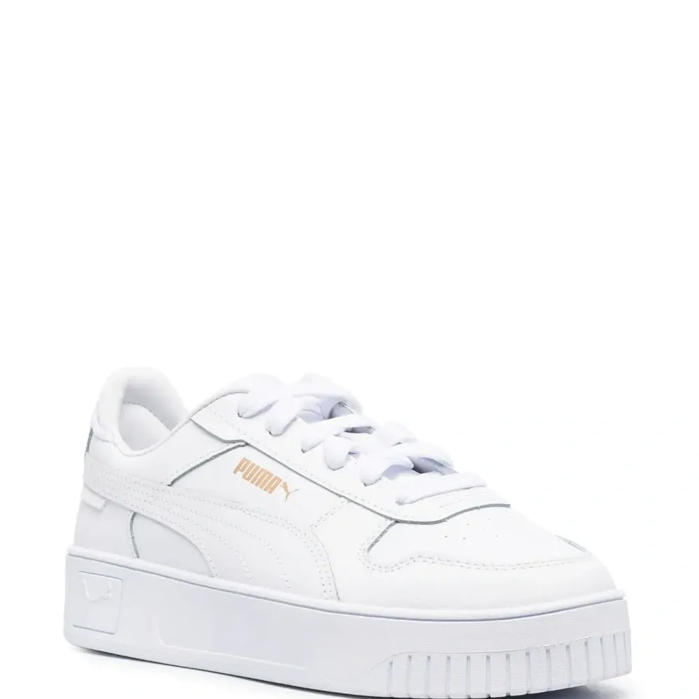 Белый, телячья кожа, перфорация, логотип сбоку, нашивка с логотипом на язычке, логотип на подошве, задник с логотипом, закругленный носок, шнуровка спереди, стелька с логотипом и плоская резиновая подошва.