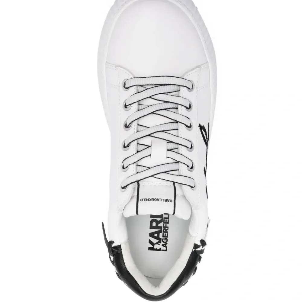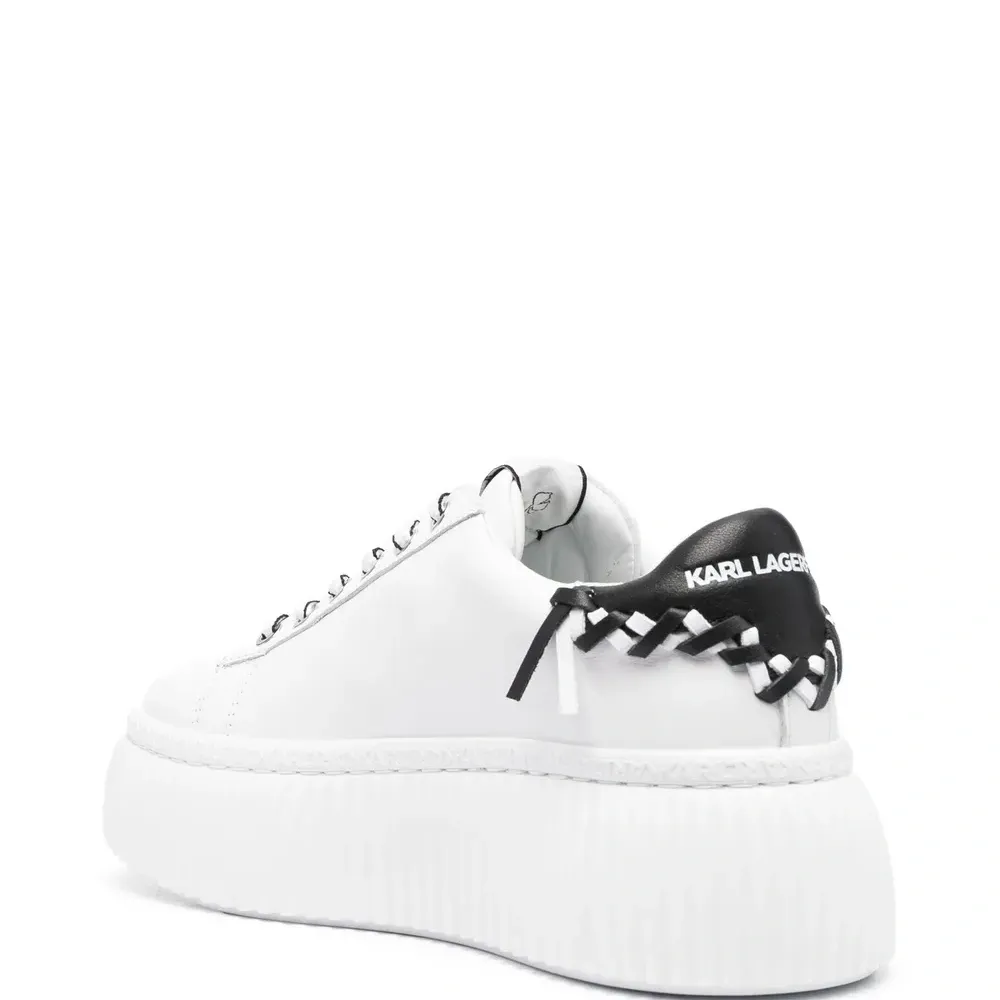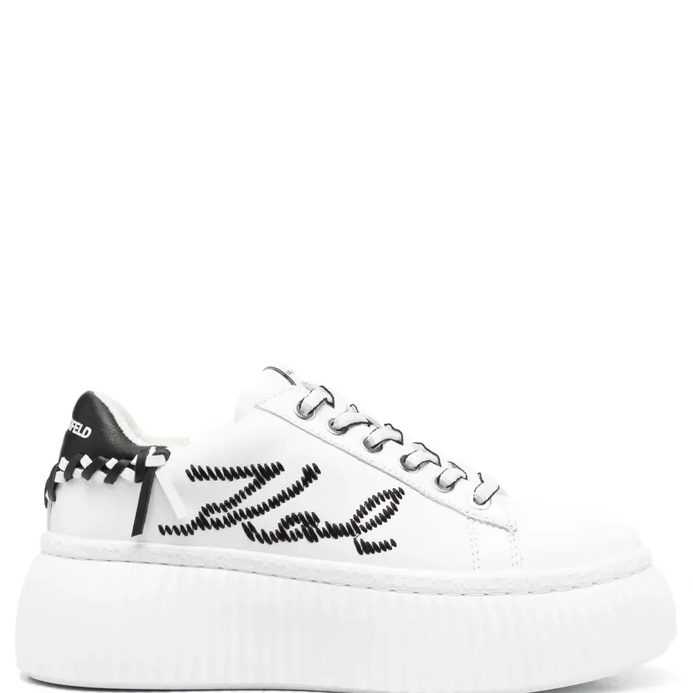 Белый/черный, телячья кожа, вышитый логотип сбоку, нашивка с логотипом на язычке, плетеная отделка, контрастный задник с логотипом, закругленный носок, шнуровка спереди, низкая посадка, стелька с логотипом, подошва на платформе и массивная резиновая подошва.