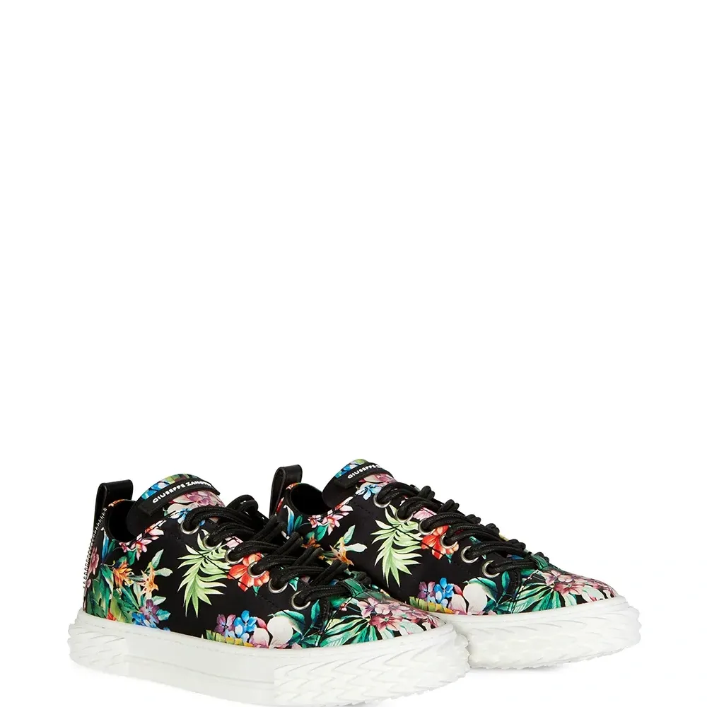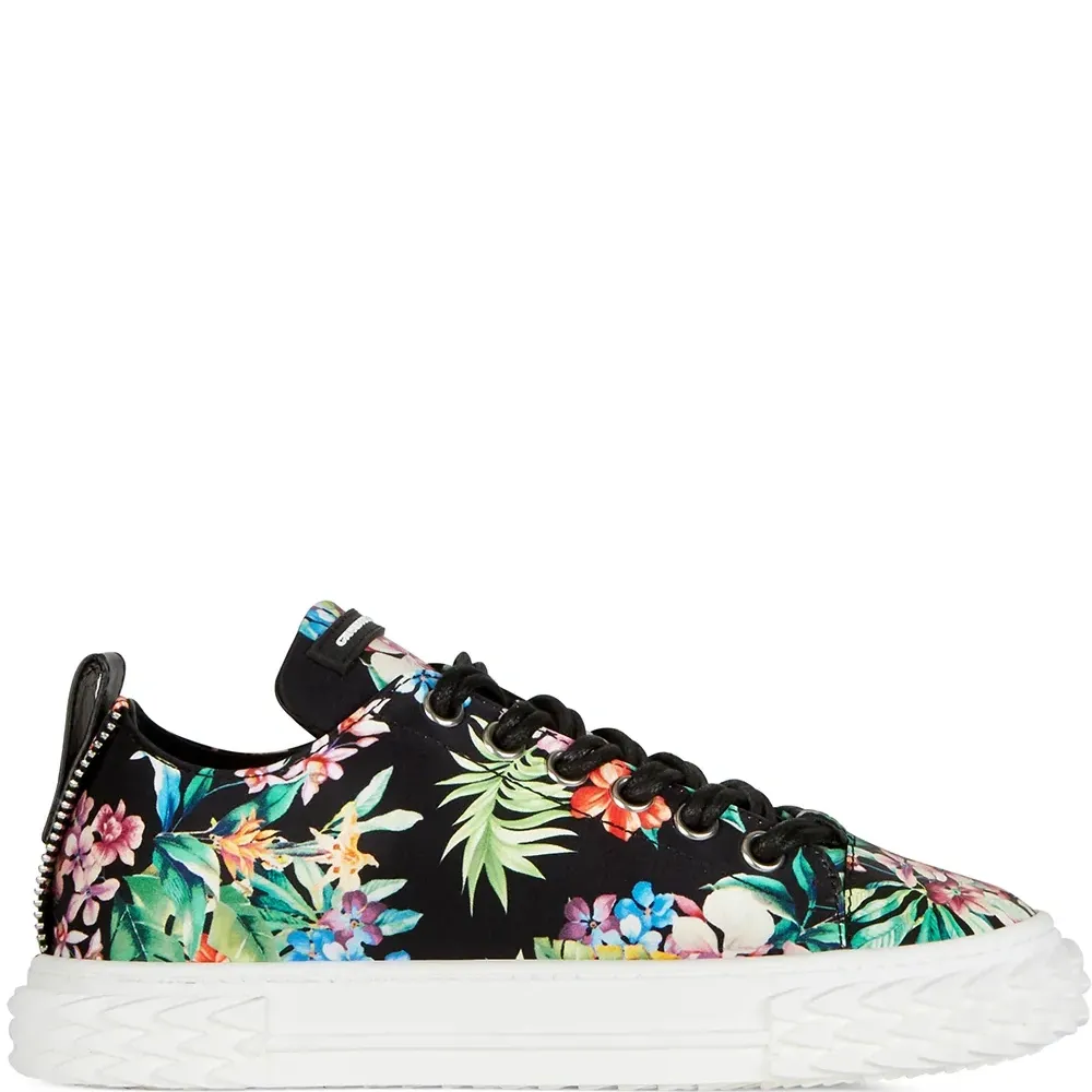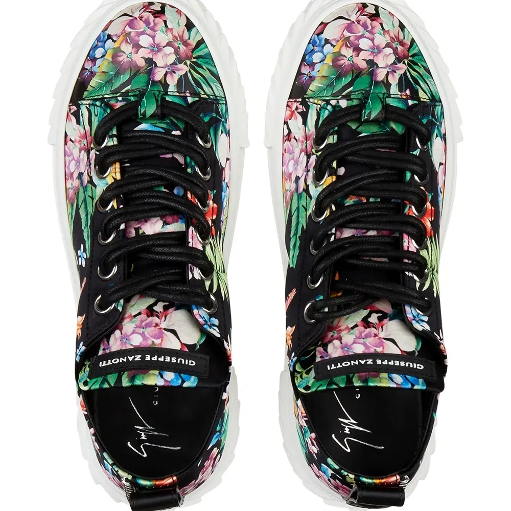 Сплошной цветочный принт, закругленный носок, шнуровка спереди, нашивка с логотипом на язычке, стелька с логотипом и плоская резиновая подошва.