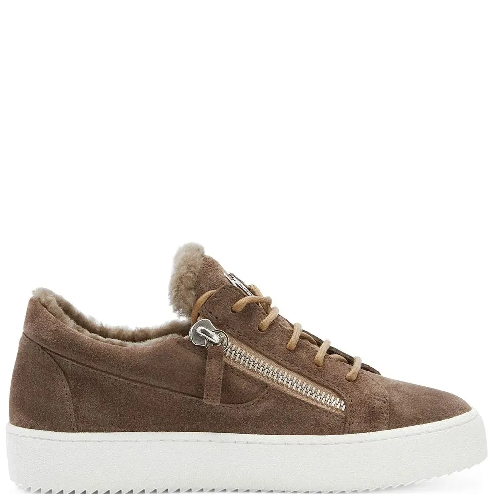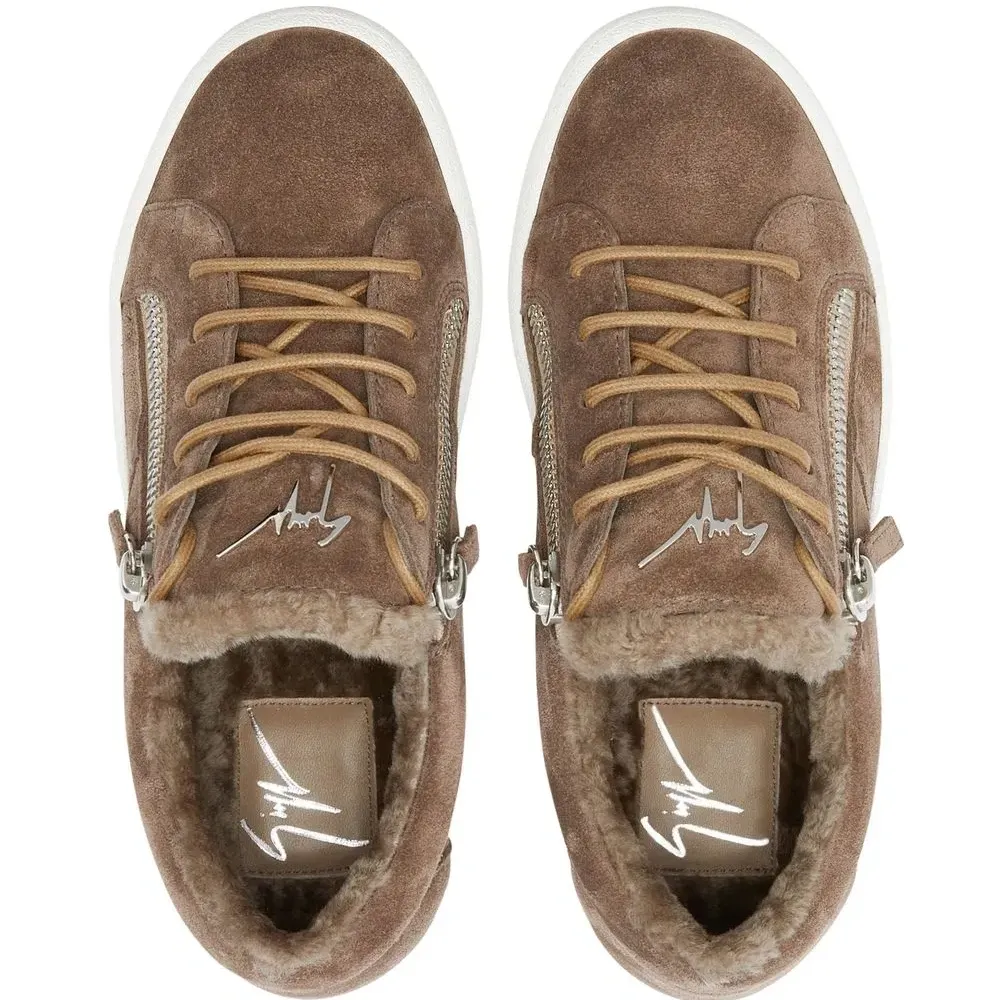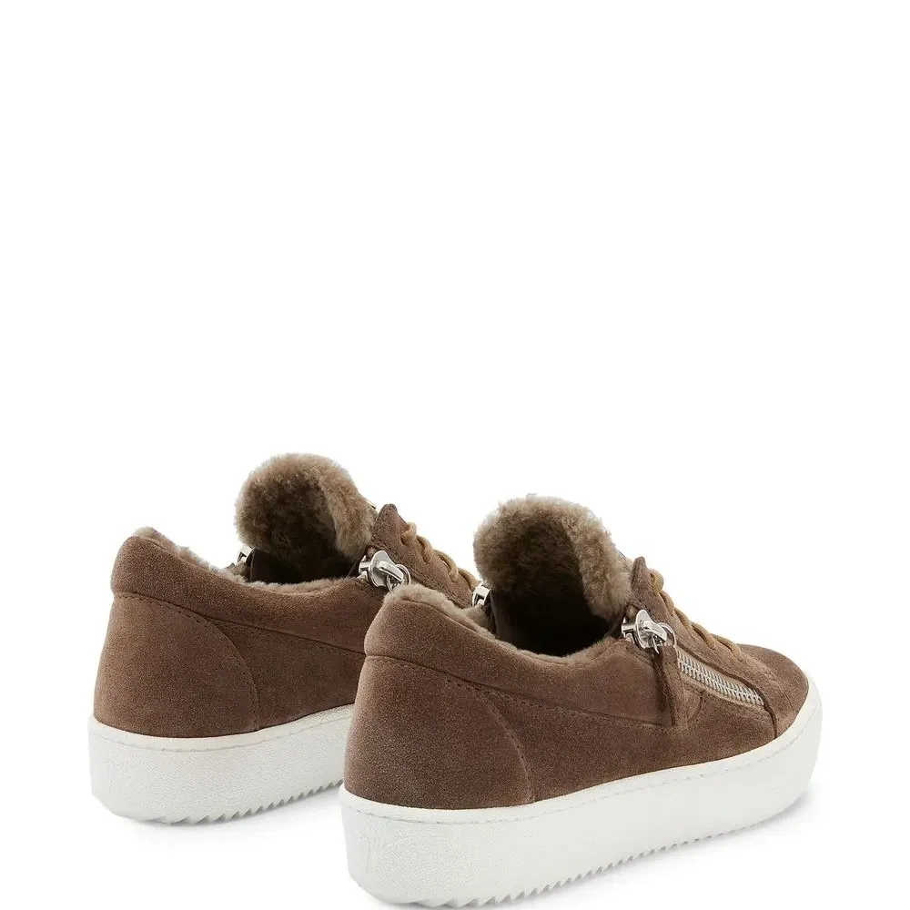Коричневый, белый, замша, овечья кожа, отделка из овчины, серебристая фурнитура, металлический логотип на язычке, стелька с логотипом, шнуровка спереди, застежки на молнии сбоку, закругленный носок и контрастная резиновая подошва.