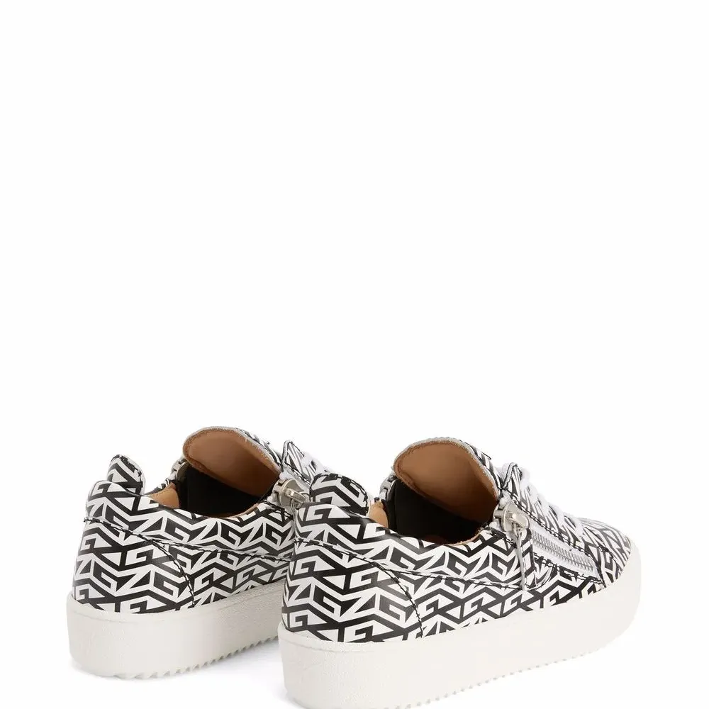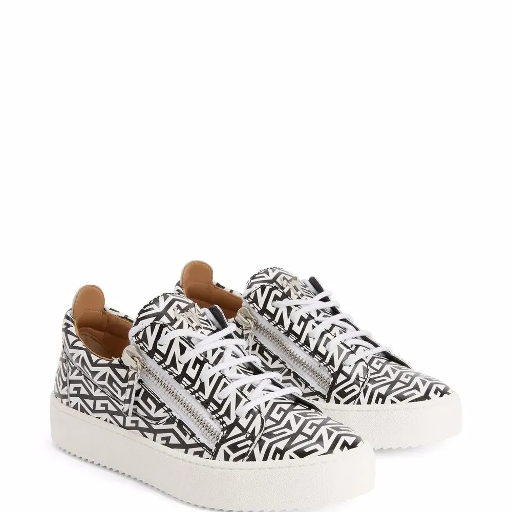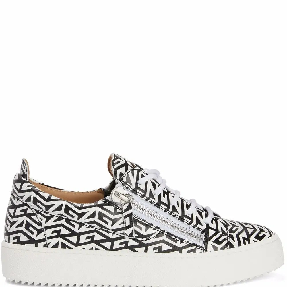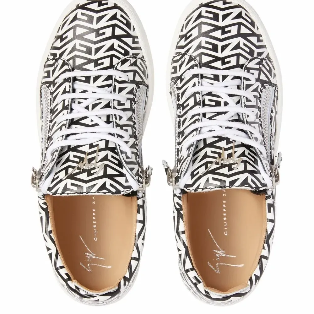 Узор с изображением монограммы, закругленный носок, шнуровка спереди, отделка с декоративной молнией, стелька с логотипом и плоская резиновая подошва.