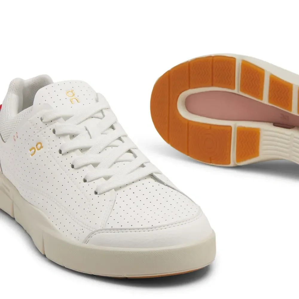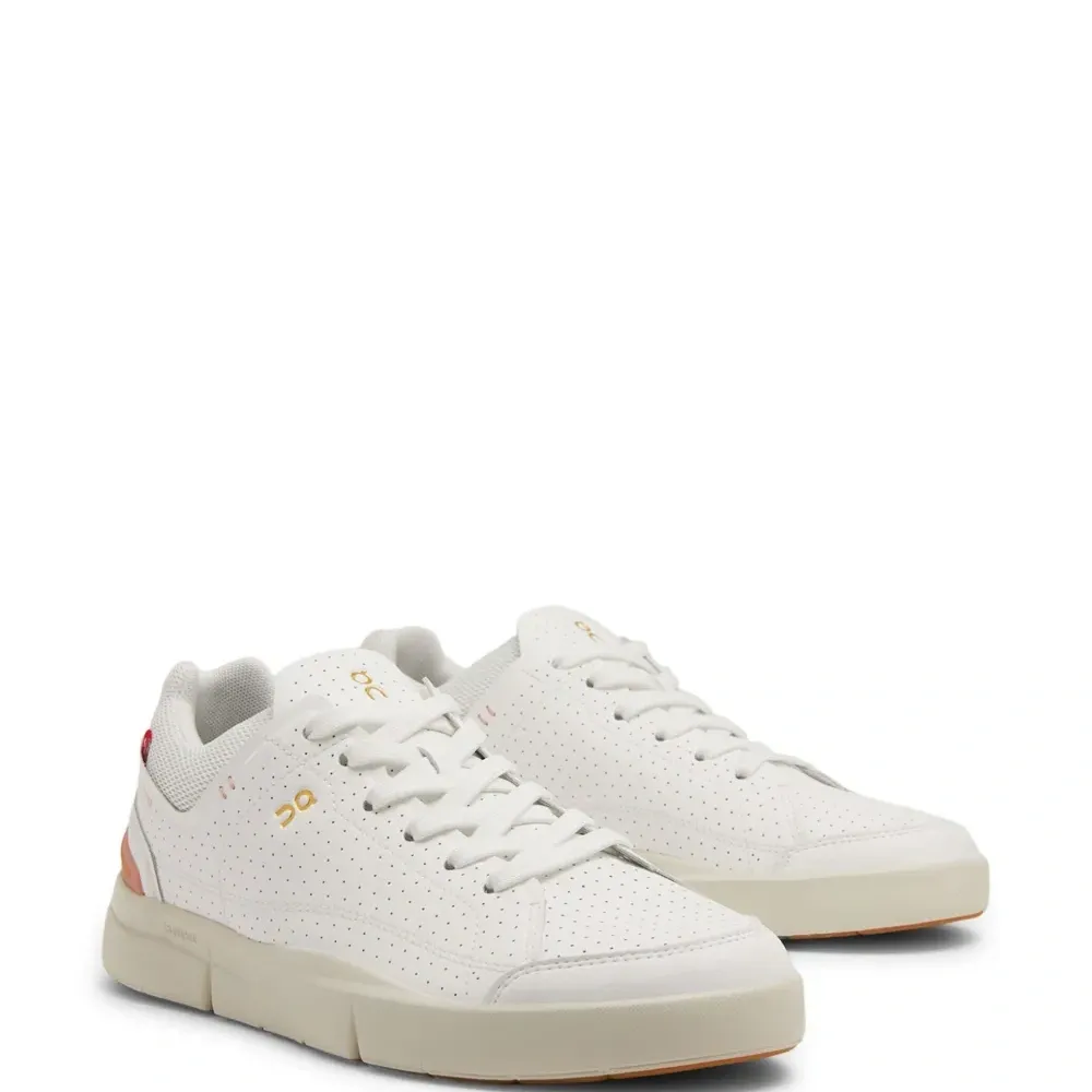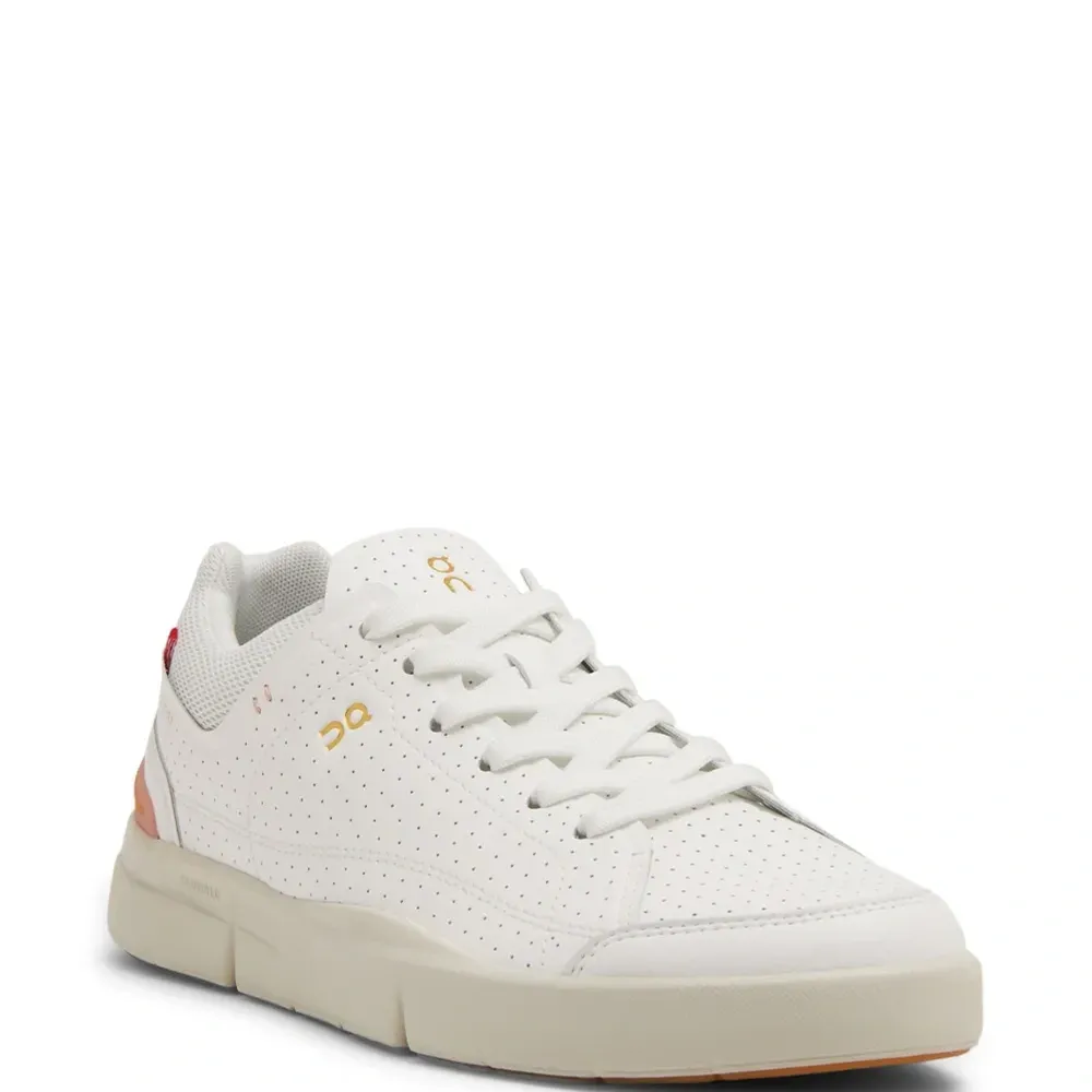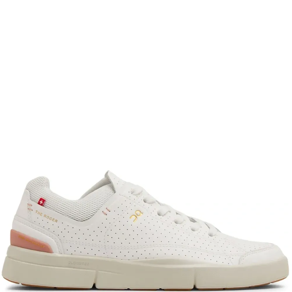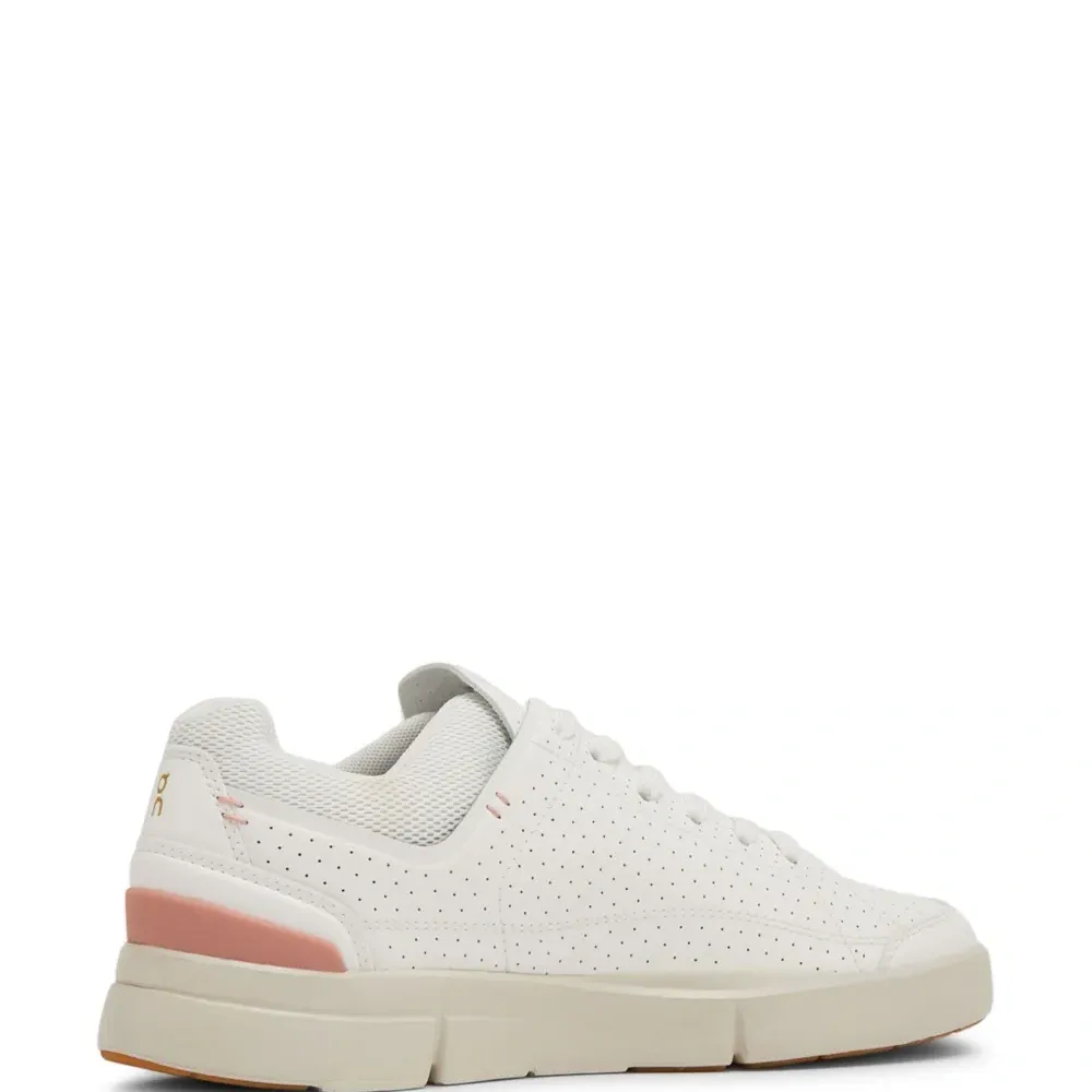 Молочно-белый, кораллово-розовый, искусственная кожа, перфорированная модель, логотип сбоку, язычок с логотипом, нашивка с логотипом сбоку, логотип, вставки из сетчатой ткани, закругленный носок, шнуровка спереди, стелька с логотипом и массивная резиновая подошва.