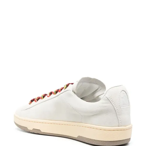 Белый, телячья кожа, замша, закругленный носок, тисненый логотип сбоку, нашивка с логотипом на язычке, шнуровка спереди, контрастные шнурки, задник с логотипом и плоская резиновая подошва.