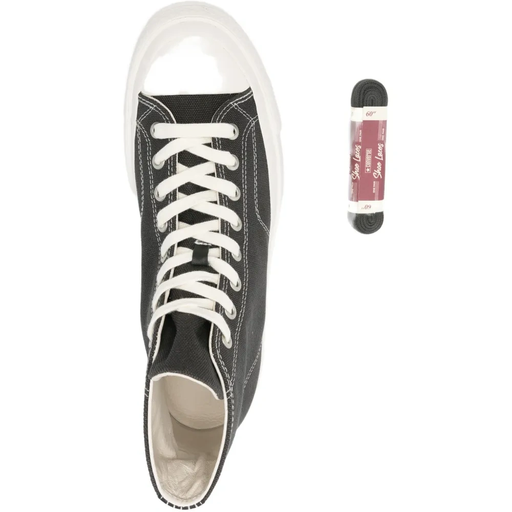 высокие черные кеды с прошивкой, шнуровкой спереди, круглым носком и плоской резиновой подошвой. Поставляются с защитным чехлом для хранения.