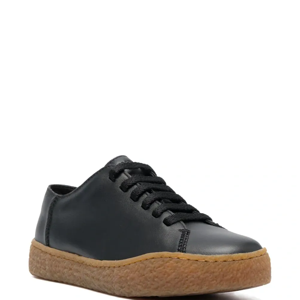 Черный, кожа, переработанный полиэстер, строчка в тон, тисненый логотип сзади, закругленный носок, шнуровка спереди, стелька с логотипом и плоская резиновая подошва. Кожа в составе этого товара сделана на фабрике, сертифицированной организациями Leather Working Group (LWG) или ICEC. Это гарантирует, что производитель минимизировал негативное влияние материала на окружающую среду. Узнать больше о том, какие товары получают отметку «Ответственный выбор», можно из материала «Как мы оцениваем экологичность и этичность».