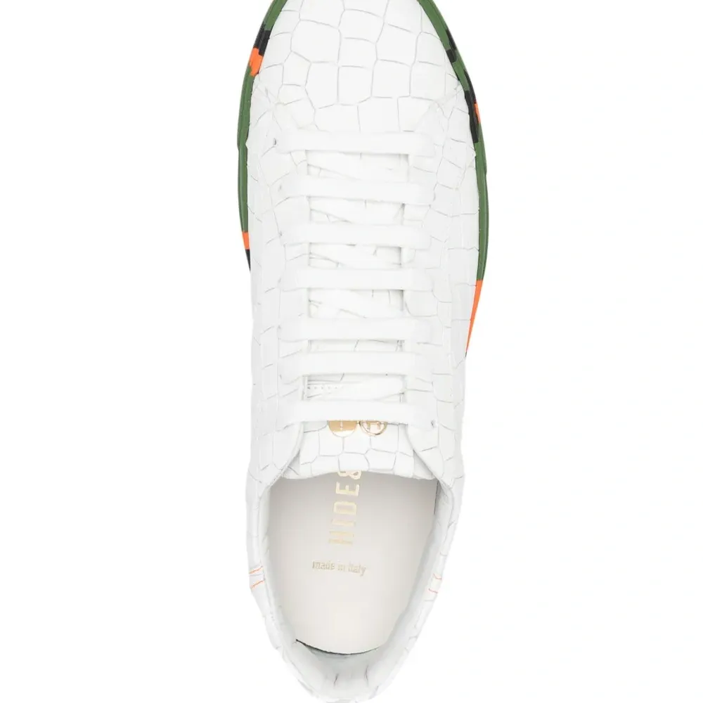 Расцветка Cloud White, морковный, тиснение под кожу крокодила, металлический логотип на язычке, закругленный носок, шнуровка спереди и подошва Vibram®. Узнать больше о том, какие товары получают отметку «Ответственный выбор», можно здесь.