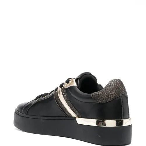 Черный, искусственная кожа, высота по щиколотку, вставки, узор с изображением монограммы, контрастная отделка, шнуровка спереди, петля для подтягивания сзади, застежка на молнии сбоку и плоская резиновая подошва.