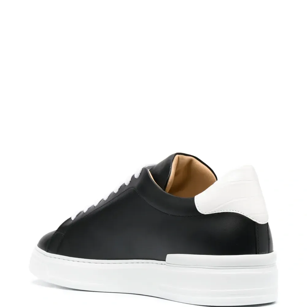 Черный/белый, телячья кожа, гладкая текстура кожи, сочетание двух оттенков, вставки, серебристый металлический логотип, контрастный задник, закругленный носок, шнуровка спереди, кожаная стелька с логотипом и плоская резиновая подошва.