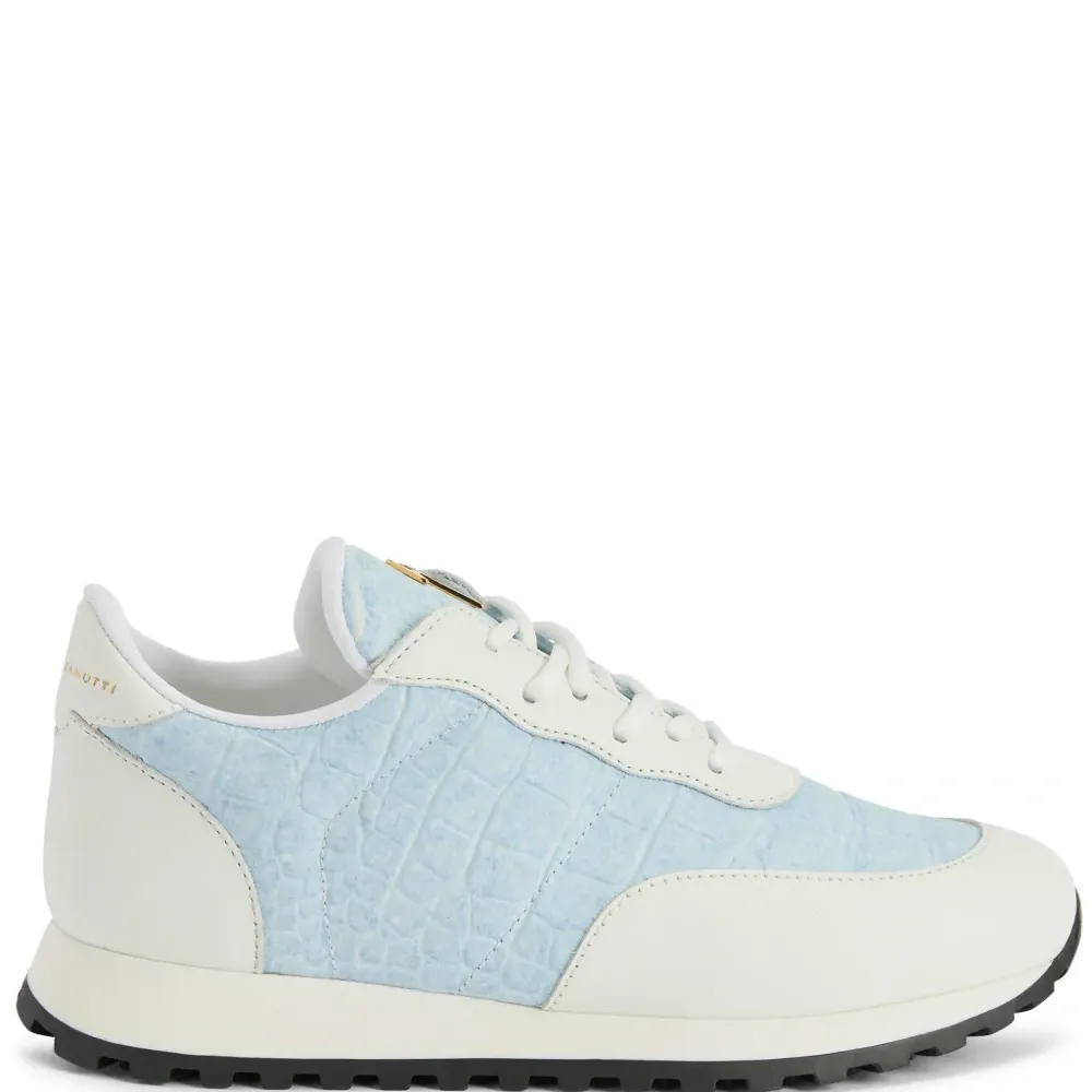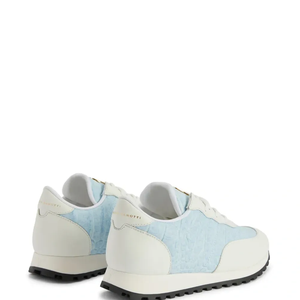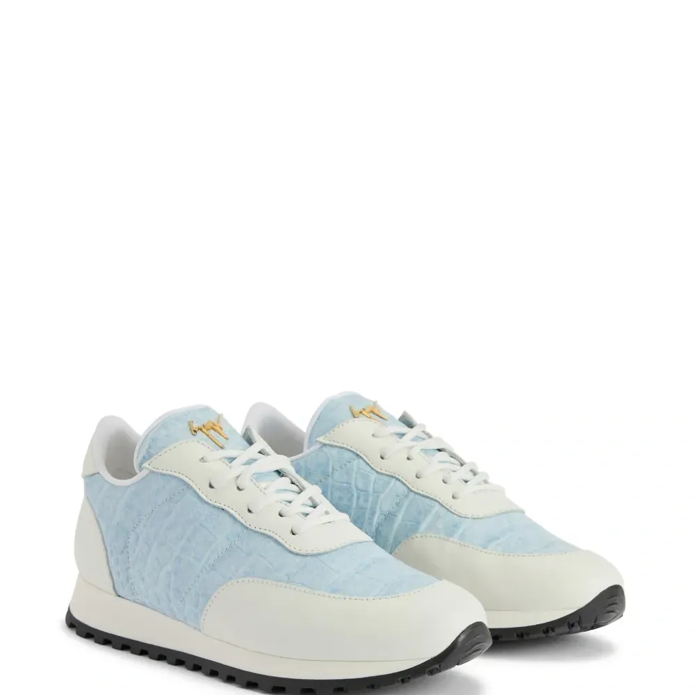 Голубой, цвет слоновой кости, кожа, тиснение под кожу крокодила, вставки, золотистый металлический логотип, металлический логотип на язычке, закругленный носок, шнуровка спереди, задник с логотипом, стелька с логотипом и рифленая резиновая подошва.