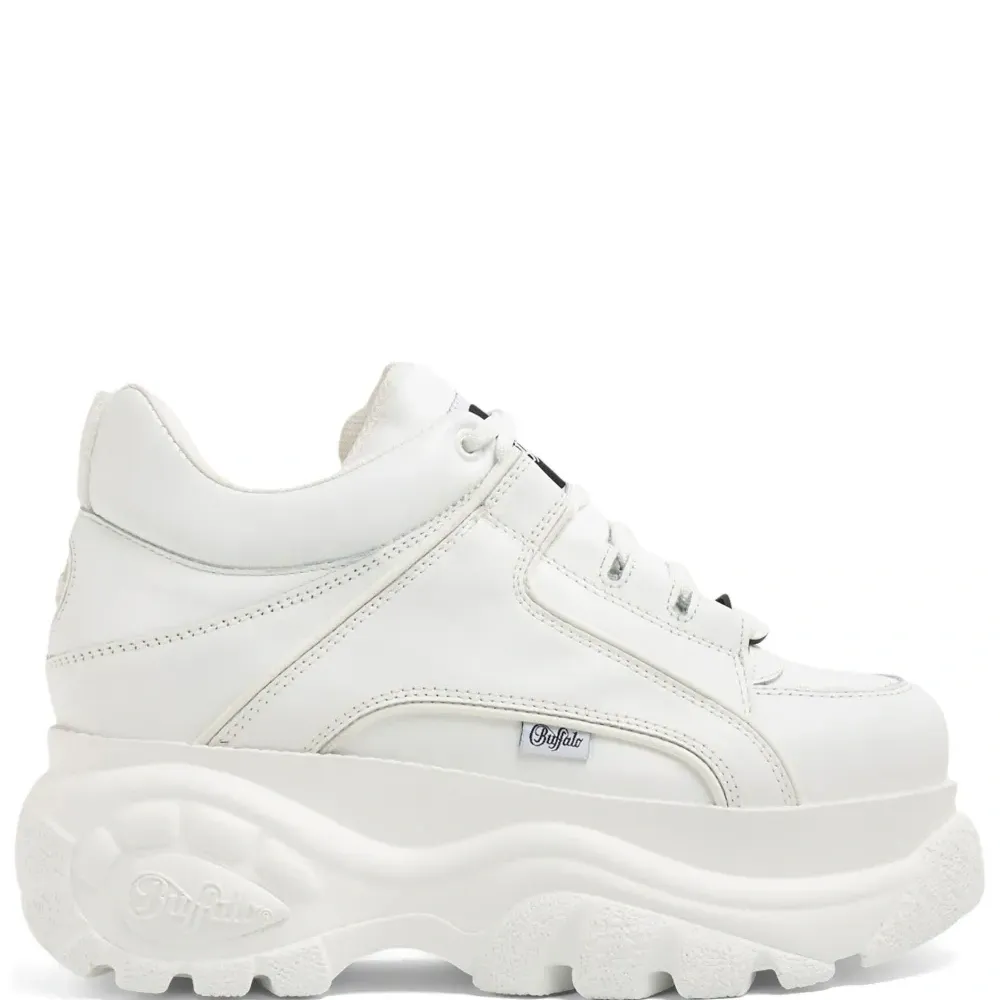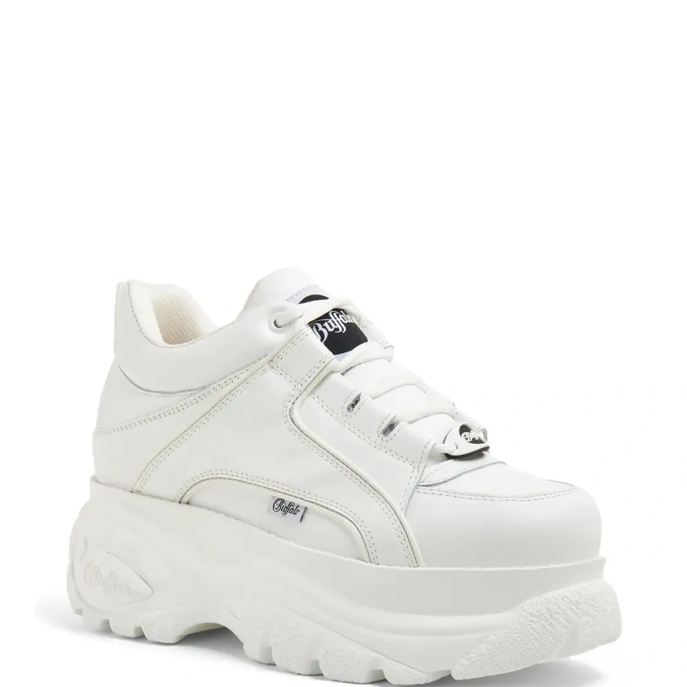 Белый, кожа, лакированная отделка, нашивка с логотипом на язычке, вставки, петля для подтягивания сзади, шнуровка спереди и массивная резиновая подошва.