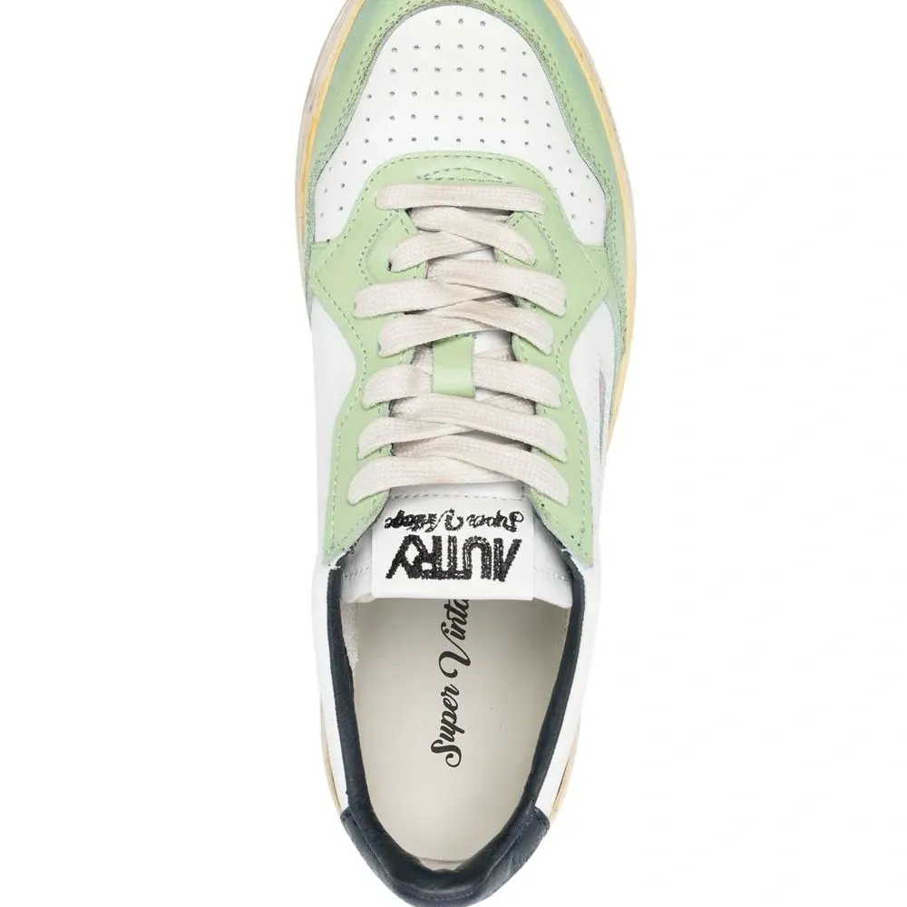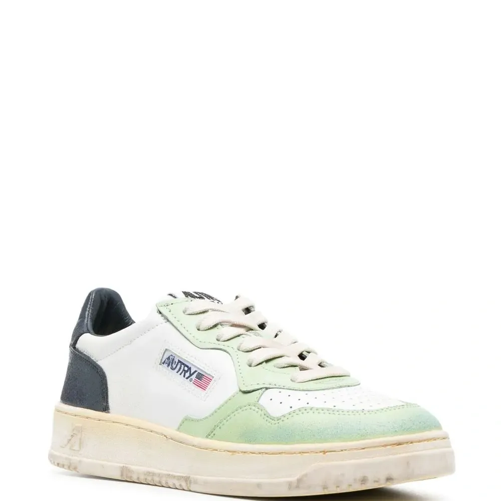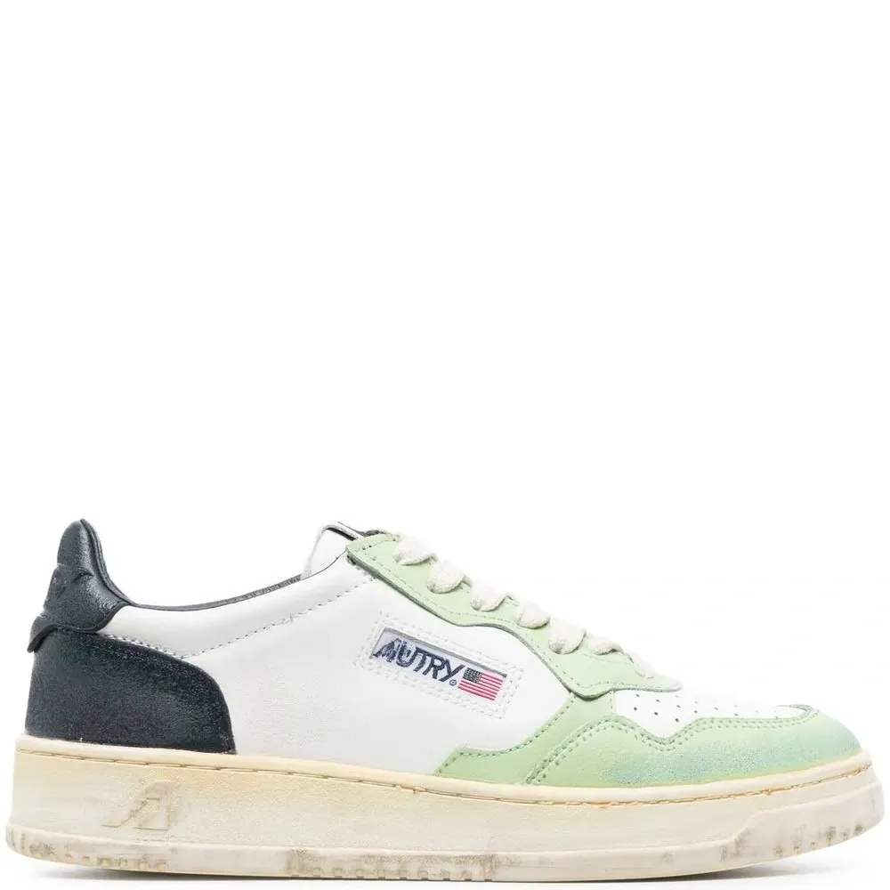 Белый, светло-зеленый, темно-синий, телячья кожа, нашивка с логотипом сбоку, перфорация, дизайн колор-блок, шнуровка спереди и плоская резиновая подошва.