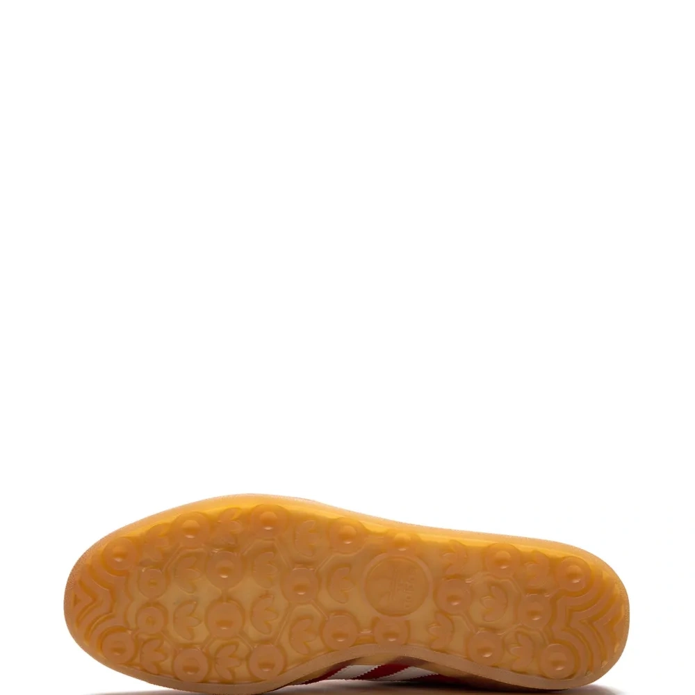 Ярко-красный, замша из телячьей кожи, логотип сбоку, полоска сбоку, язычок с логотипом, стелька с логотипом, закругленный носок, шнуровка спереди и плоская резиновая подошва.