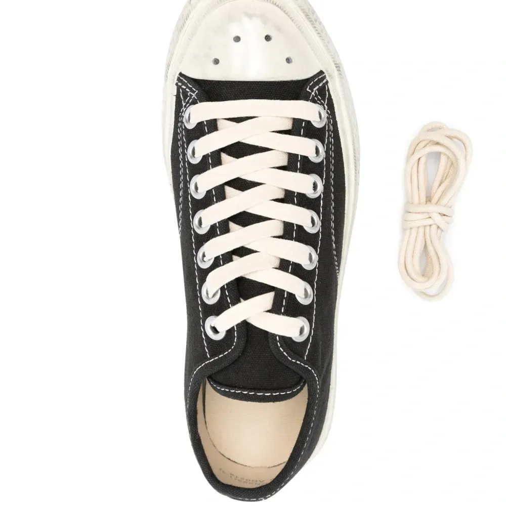 Черный, кремовый, парусина, сочетание двух оттенков, искусственно состаренное покрытие, тисненый логотип спереди, закругленный носок, шнуровка спереди, перфорированный носок, резиновый носок и плоская резиновая подошва.