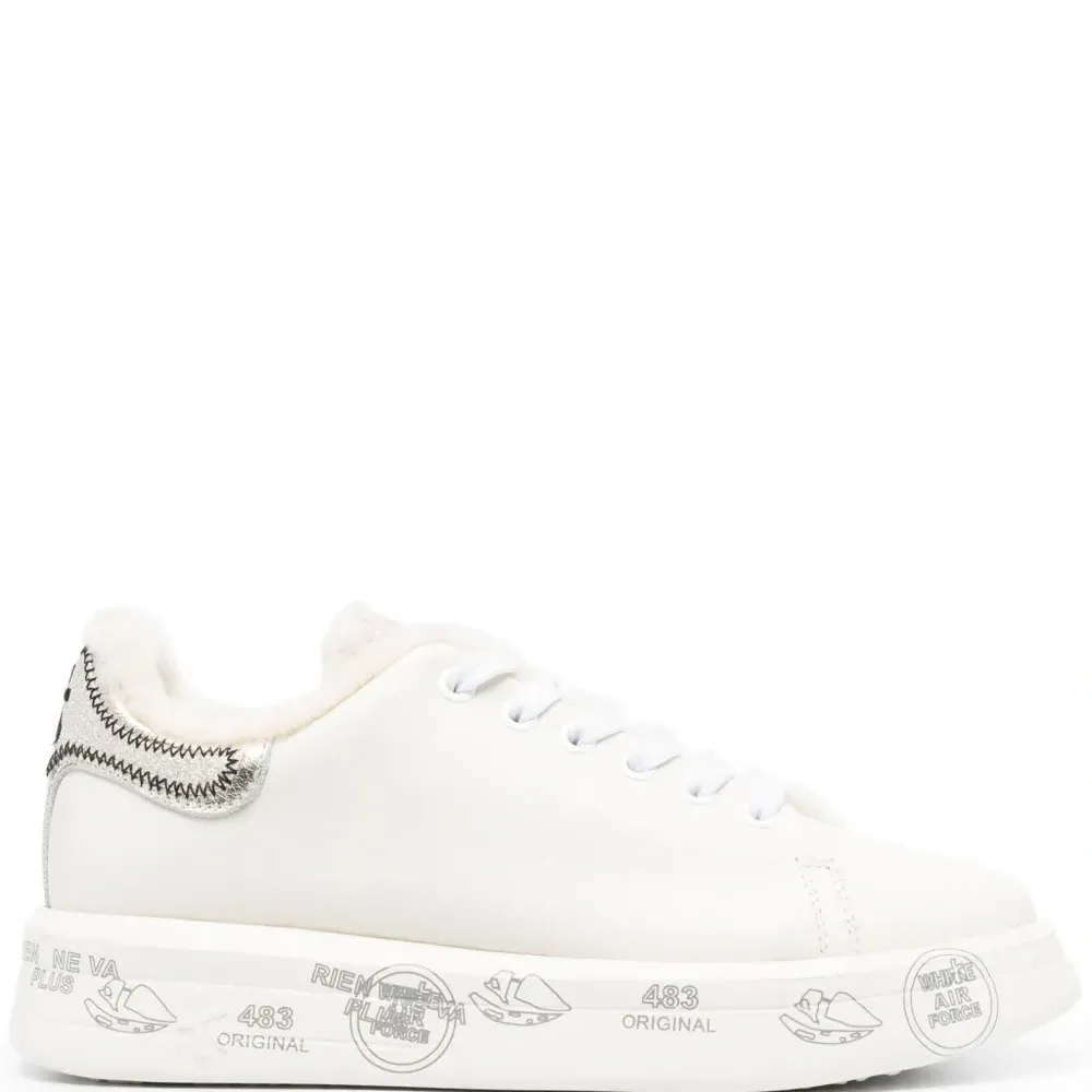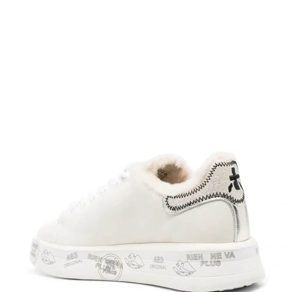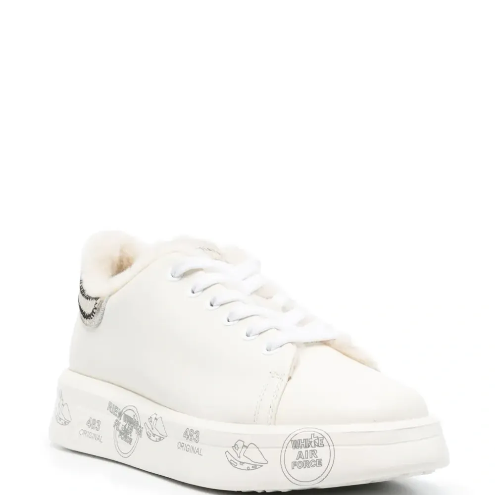 Кремовый, телячья кожа, подкладка из овечьей шерсти, закругленный носок, нашивка с логотипом на язычке, логотип на подошве, контрастный задник с логотипом, шнуровка спереди и плоская резиновая подошва.