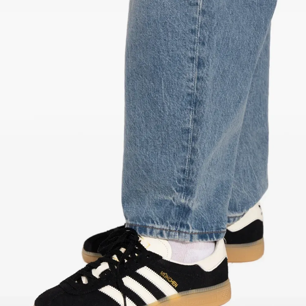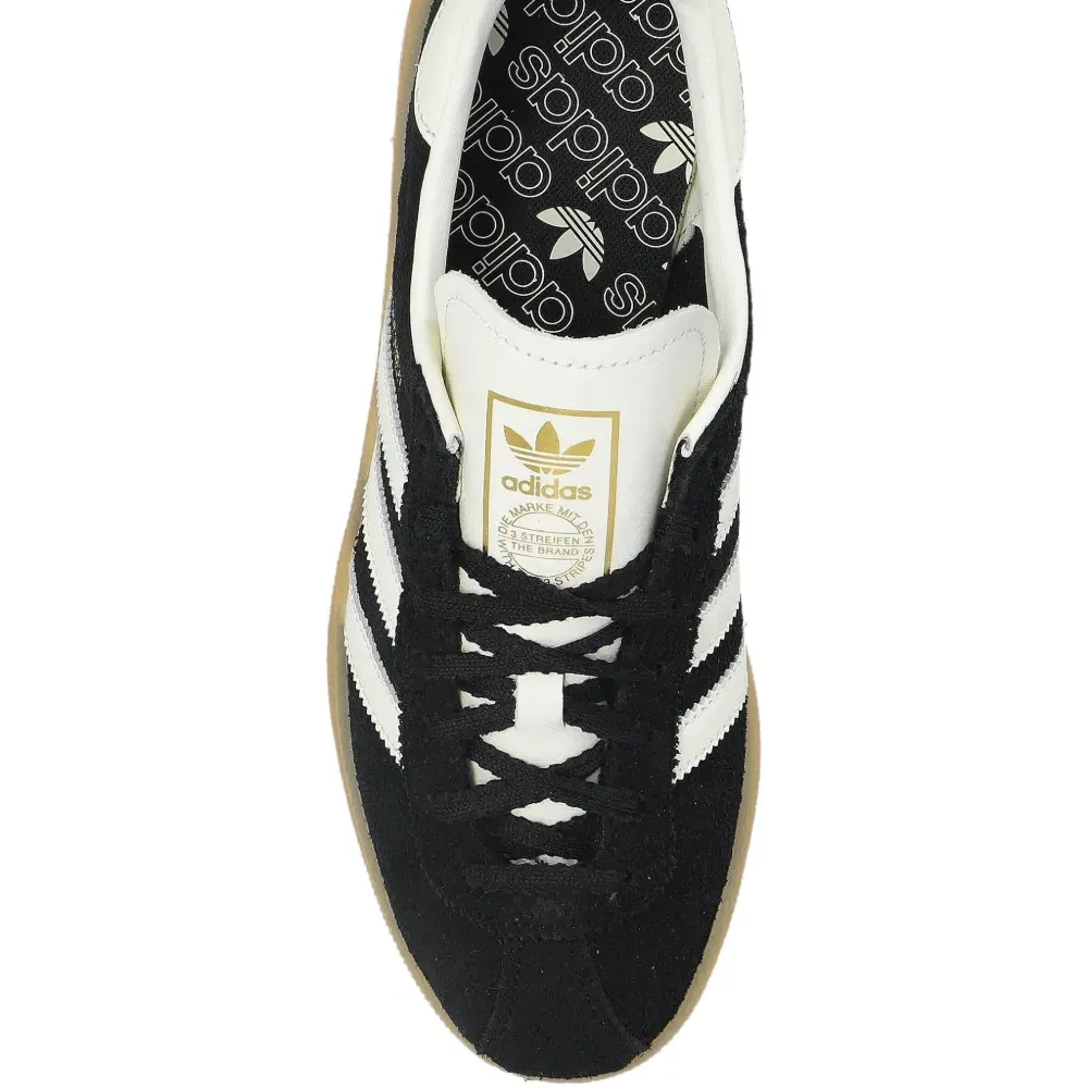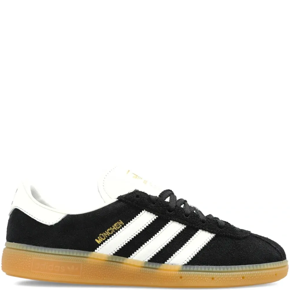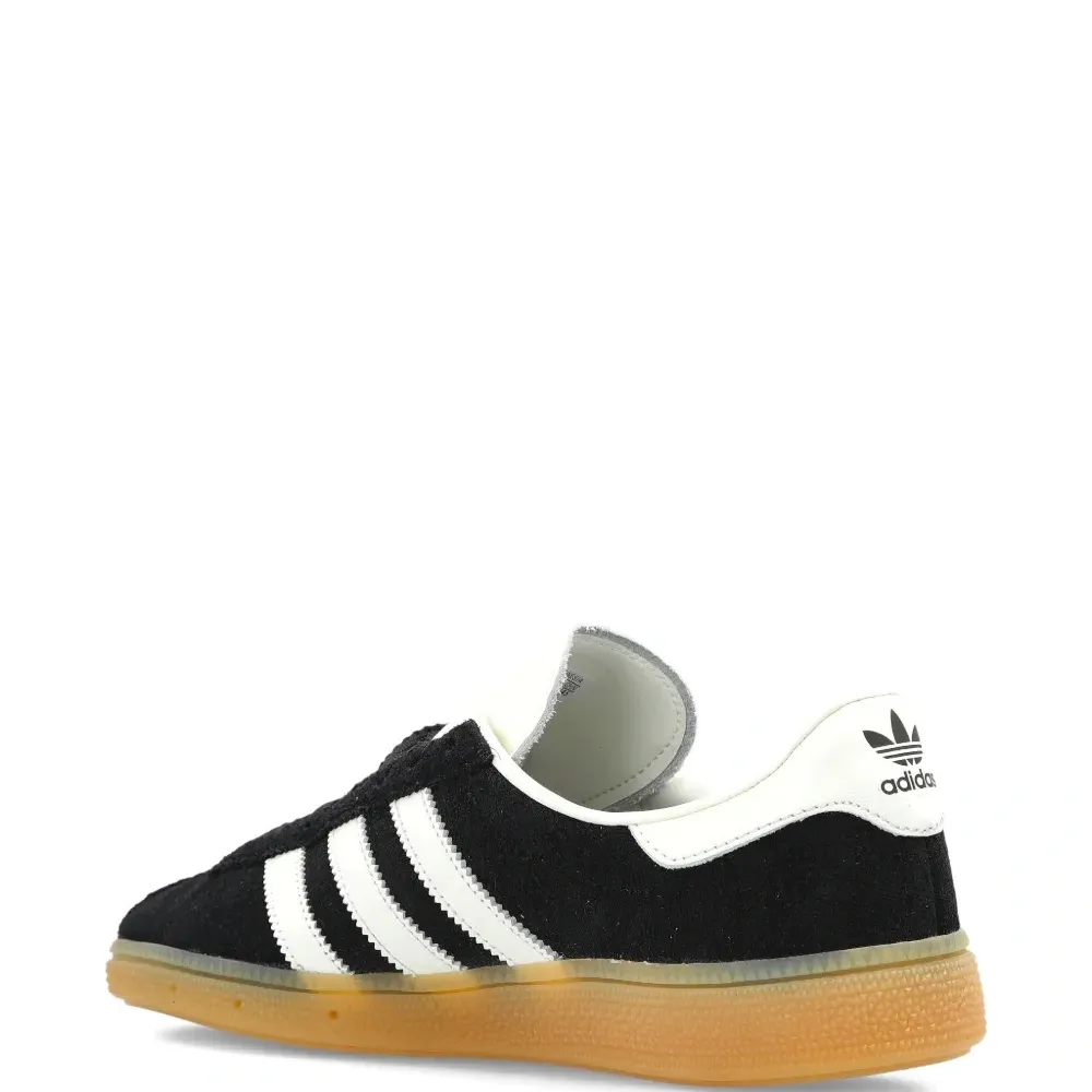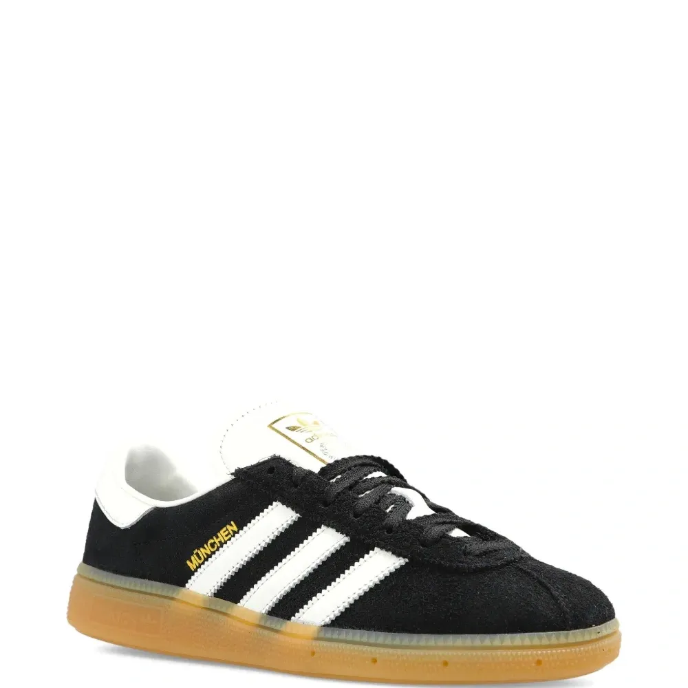 чёрные кроссовки с тремя полосками, шнуровкой спереди, контрастной вставкой на пятке, резиновой подошвой и логотипом