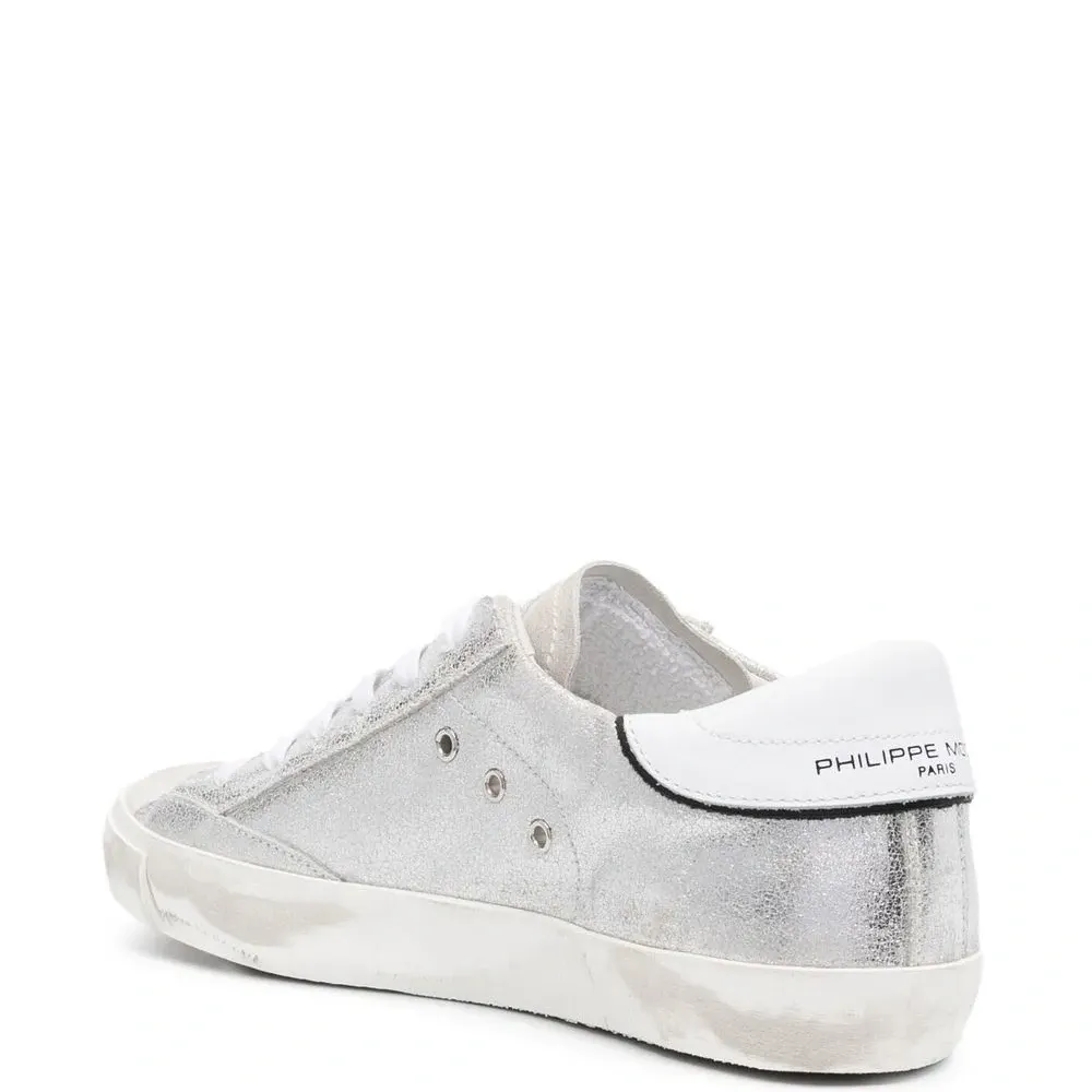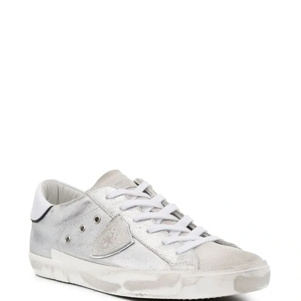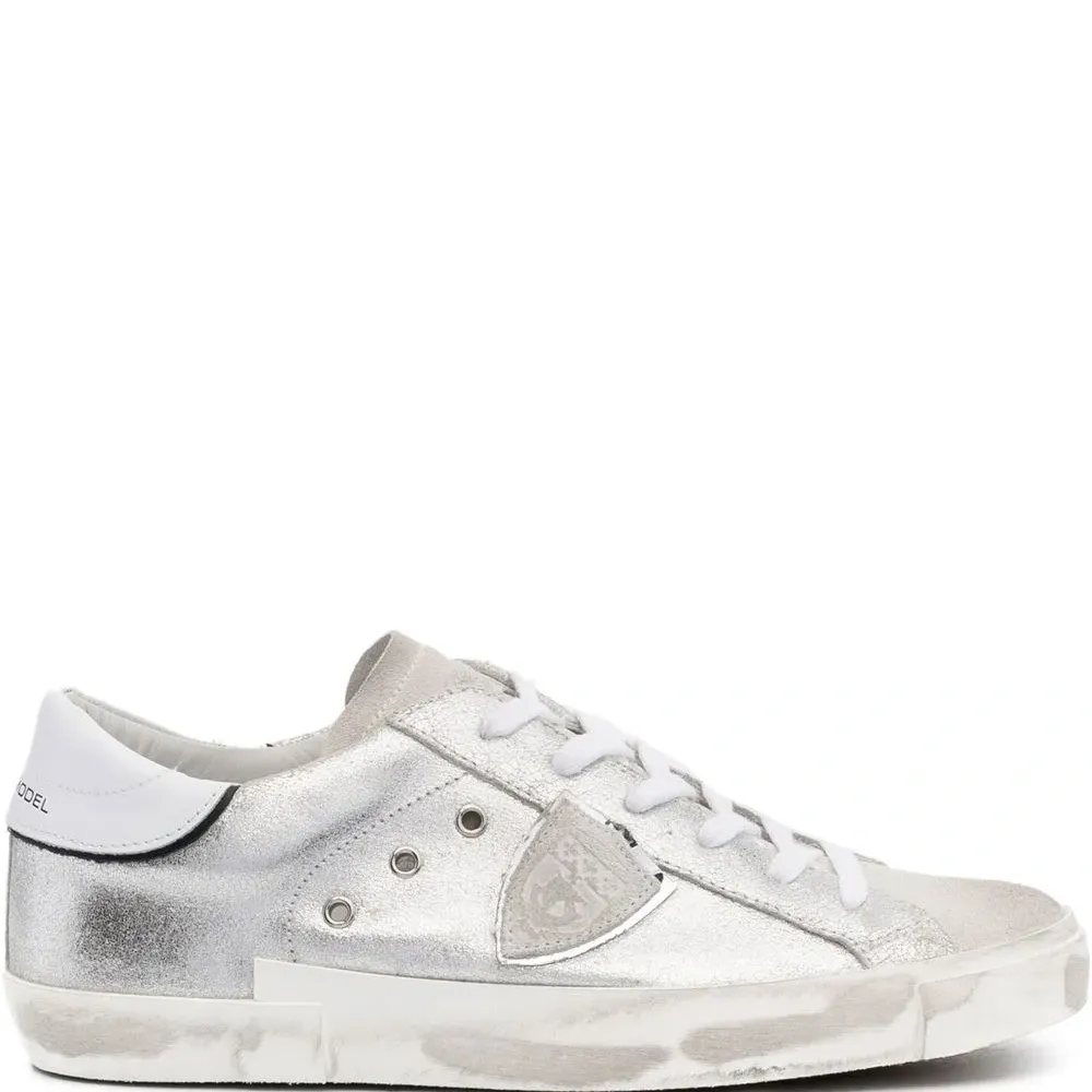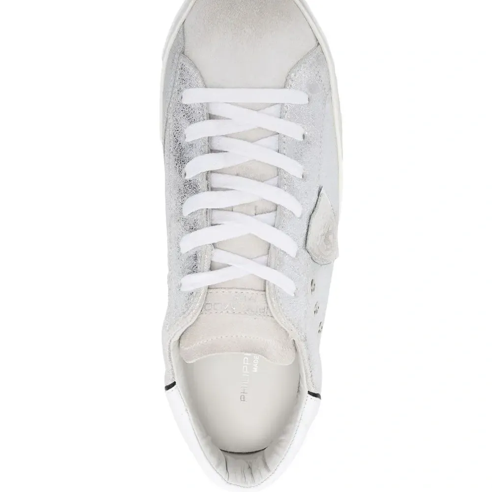 Серебро, телячья кожа, материал с жатым эффектом, замшевые вставки, нашивка с логотипом сбоку, принт с логотипом сзади, плоская подошва и шнуровка спереди.