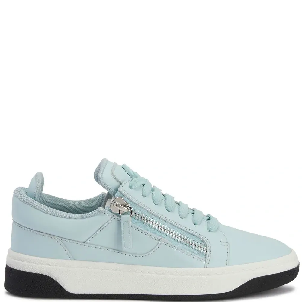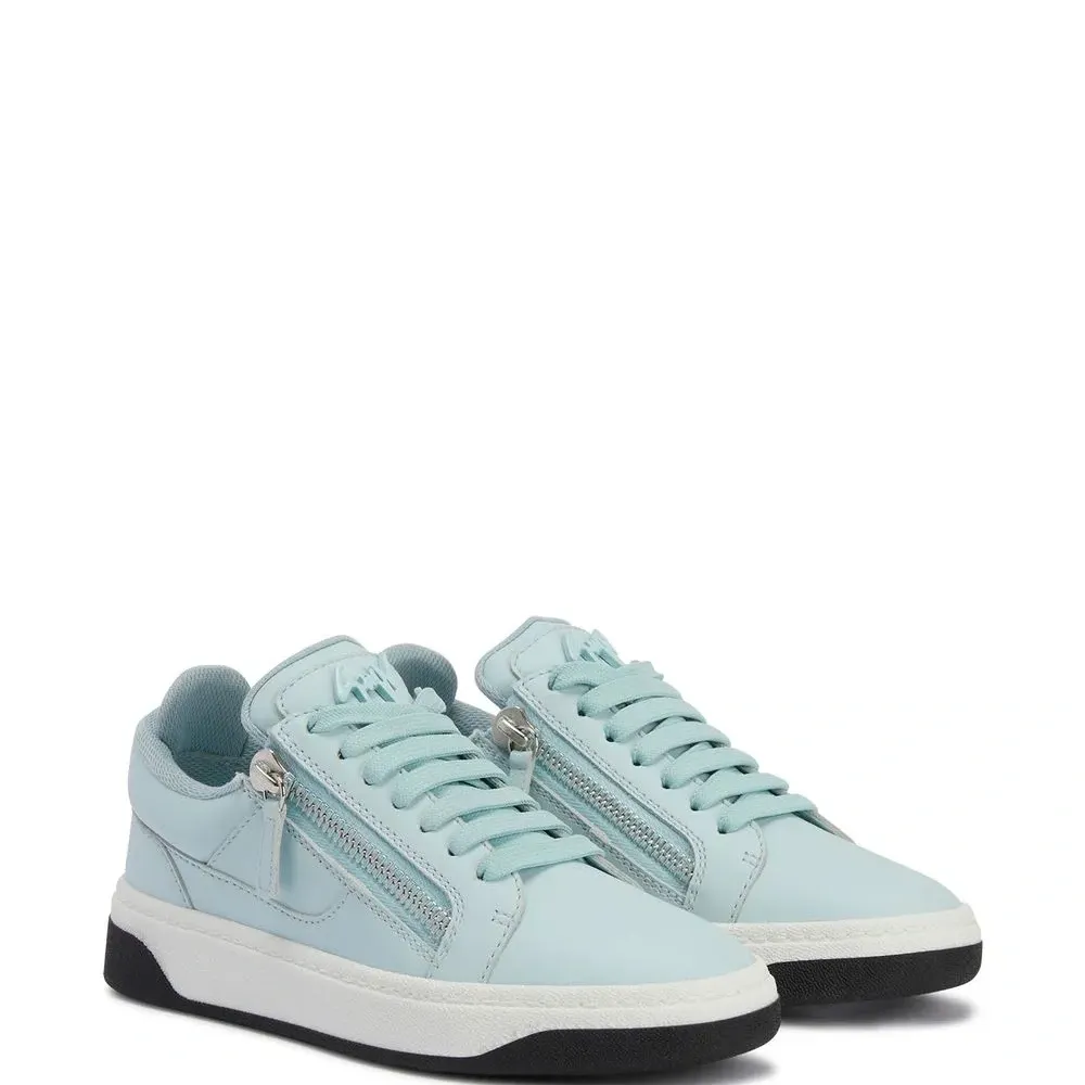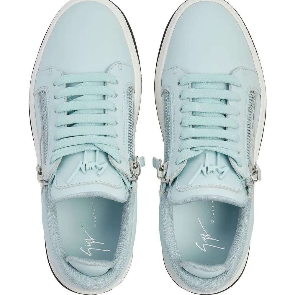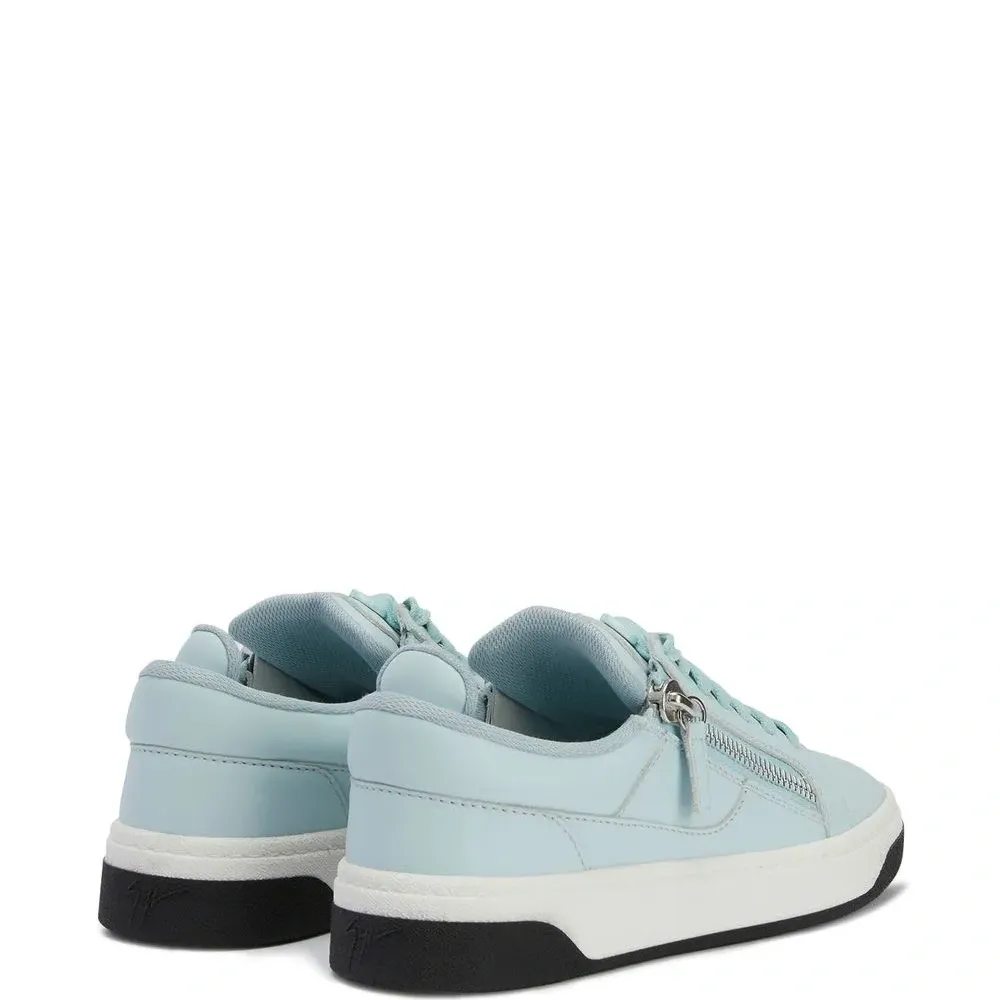 Голубой, кожа, стелька с логотипом, логотип в тон, закругленный носок, застежка на молнии спереди, шнуровка спереди и плоская резиновая подошва.