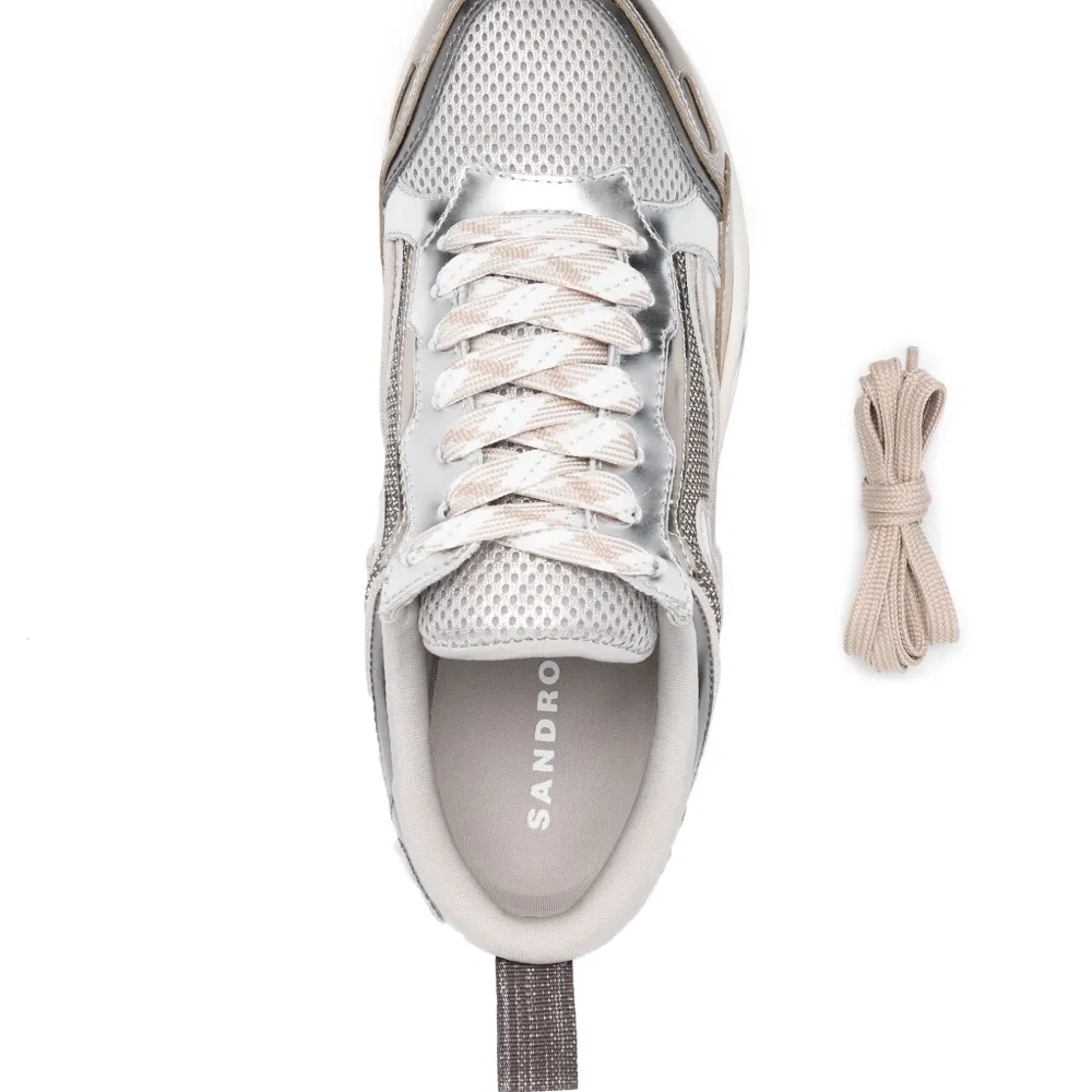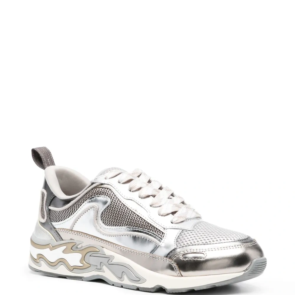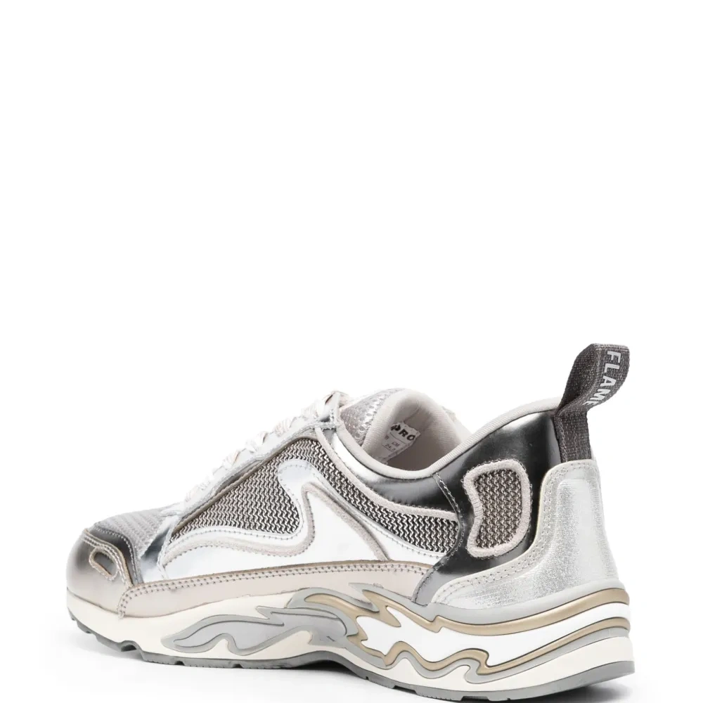 Белый, серебристый, кожаная отделка, принт с изображением пламени, лиф со вставками, сетчатые вставки, шнуровка спереди, миндалевидный носок, петля для подтягивания с логотипом, стелька с логотипом и плоская резиновая подошва.