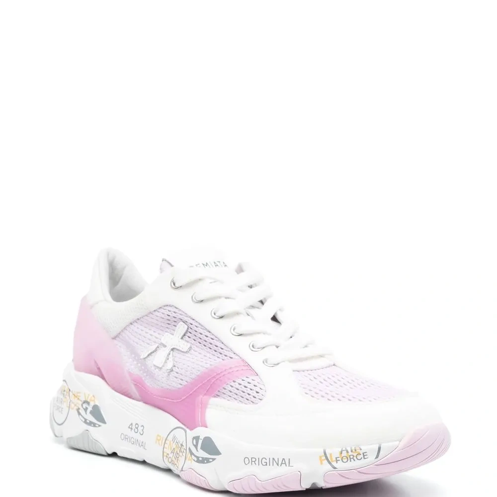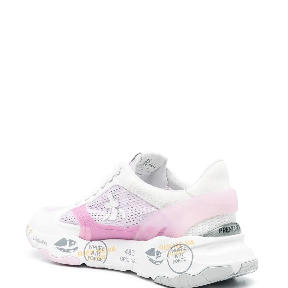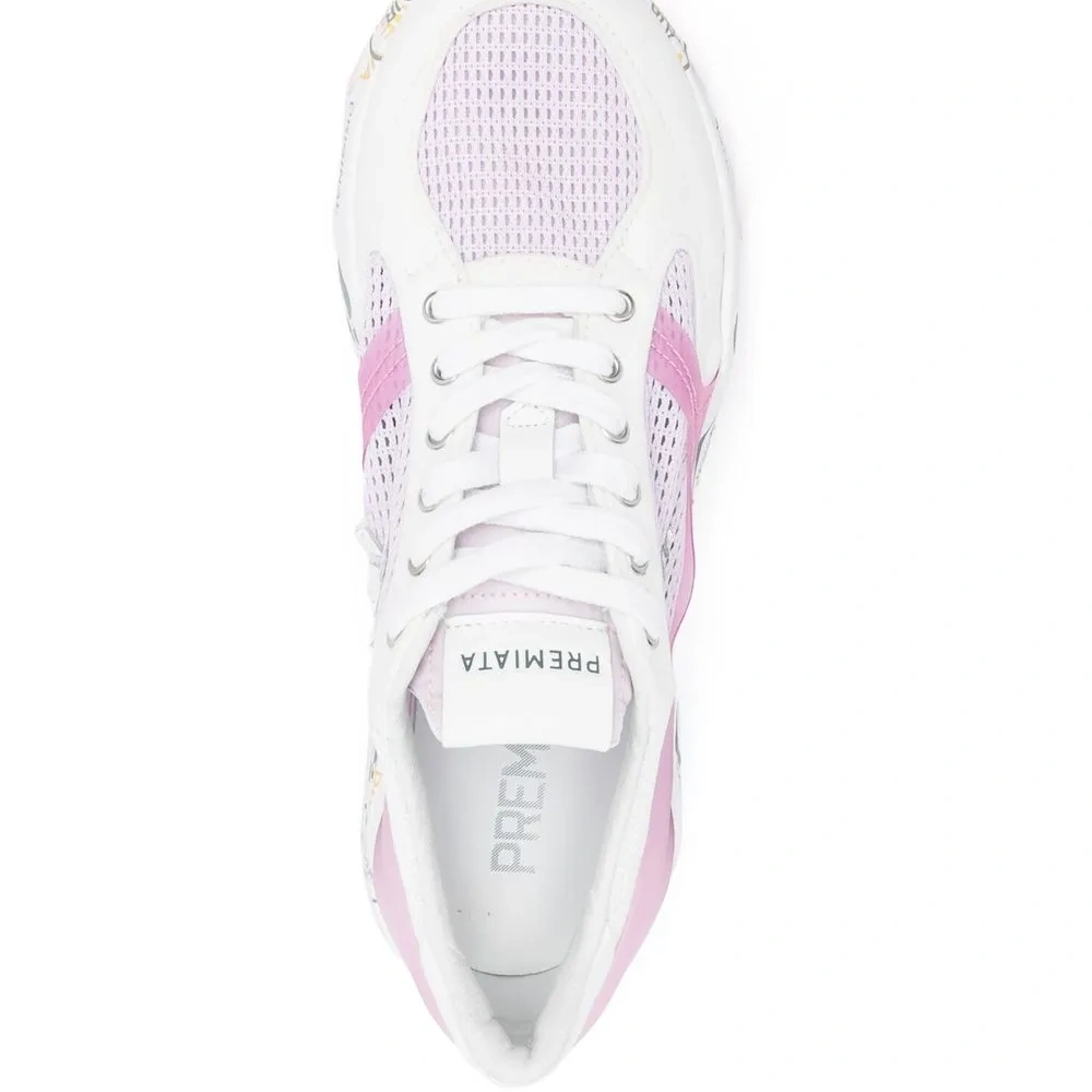Белый, нежно-розовый, телячья кожа, нашивка с логотипом сбоку, сетчатые вставки, закругленный носок, шнуровка спереди и рифленая резиновая подошва.