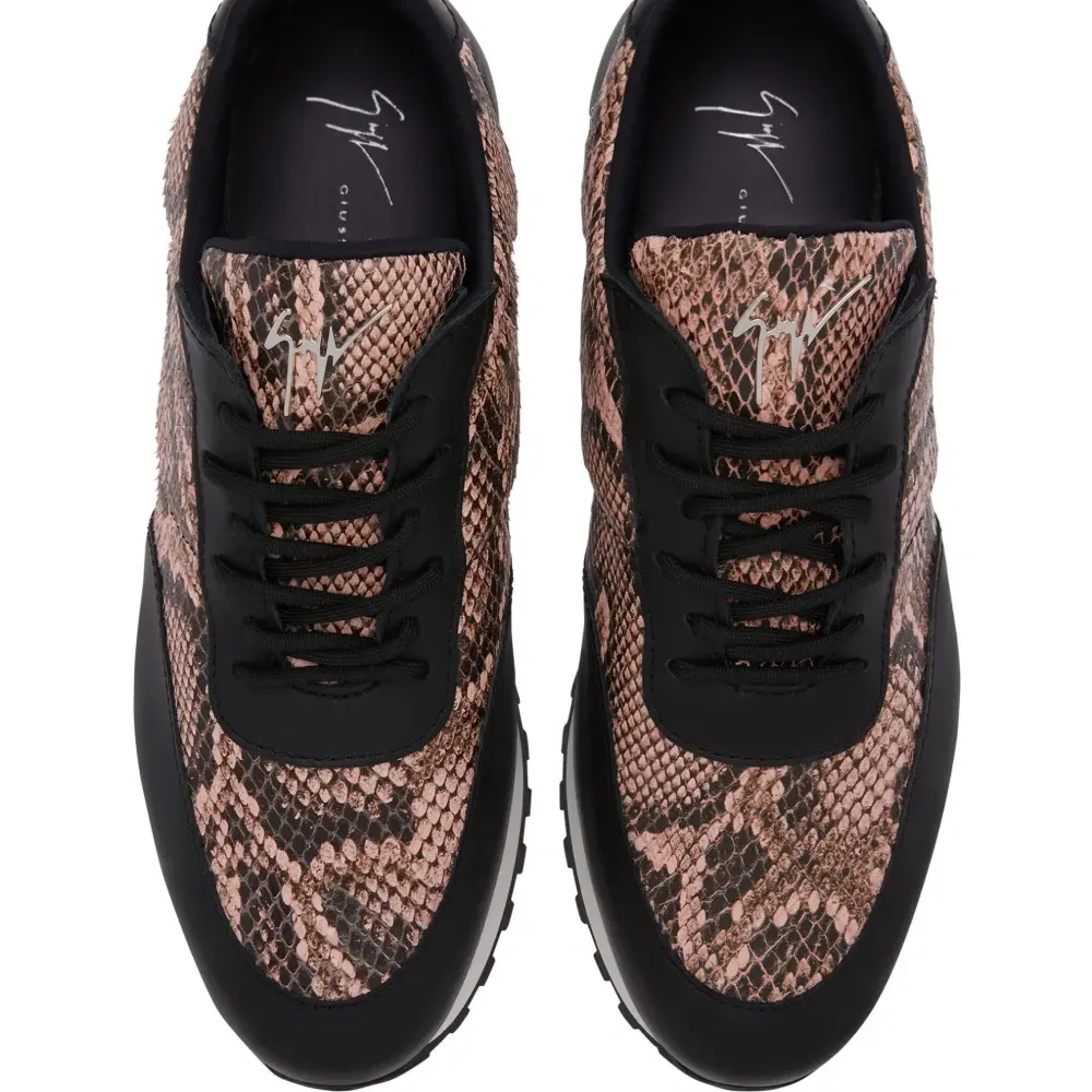 Черный, кожа, эффект змеиной кожи, вставки, металлический логотип на язычке, шнуровка спереди, миндалевидный носок, стелька с логотипом и плоская резиновая подошва.