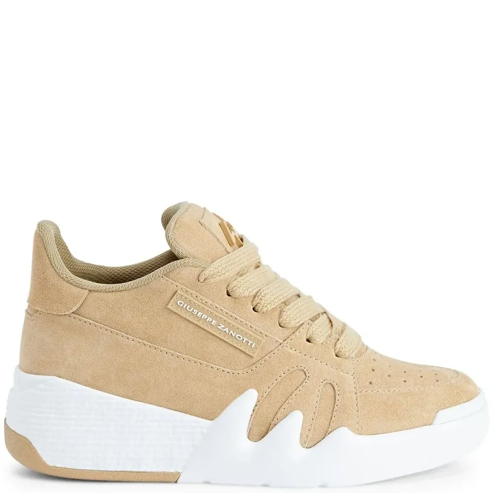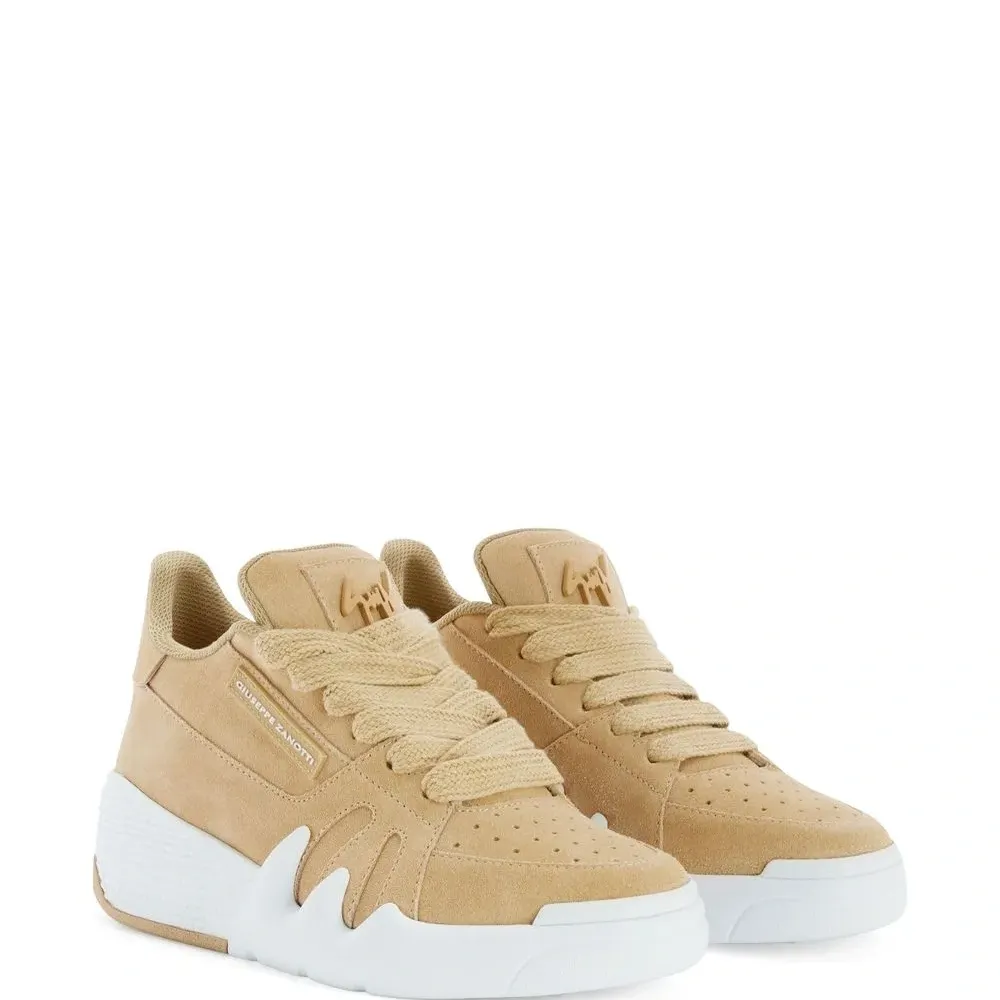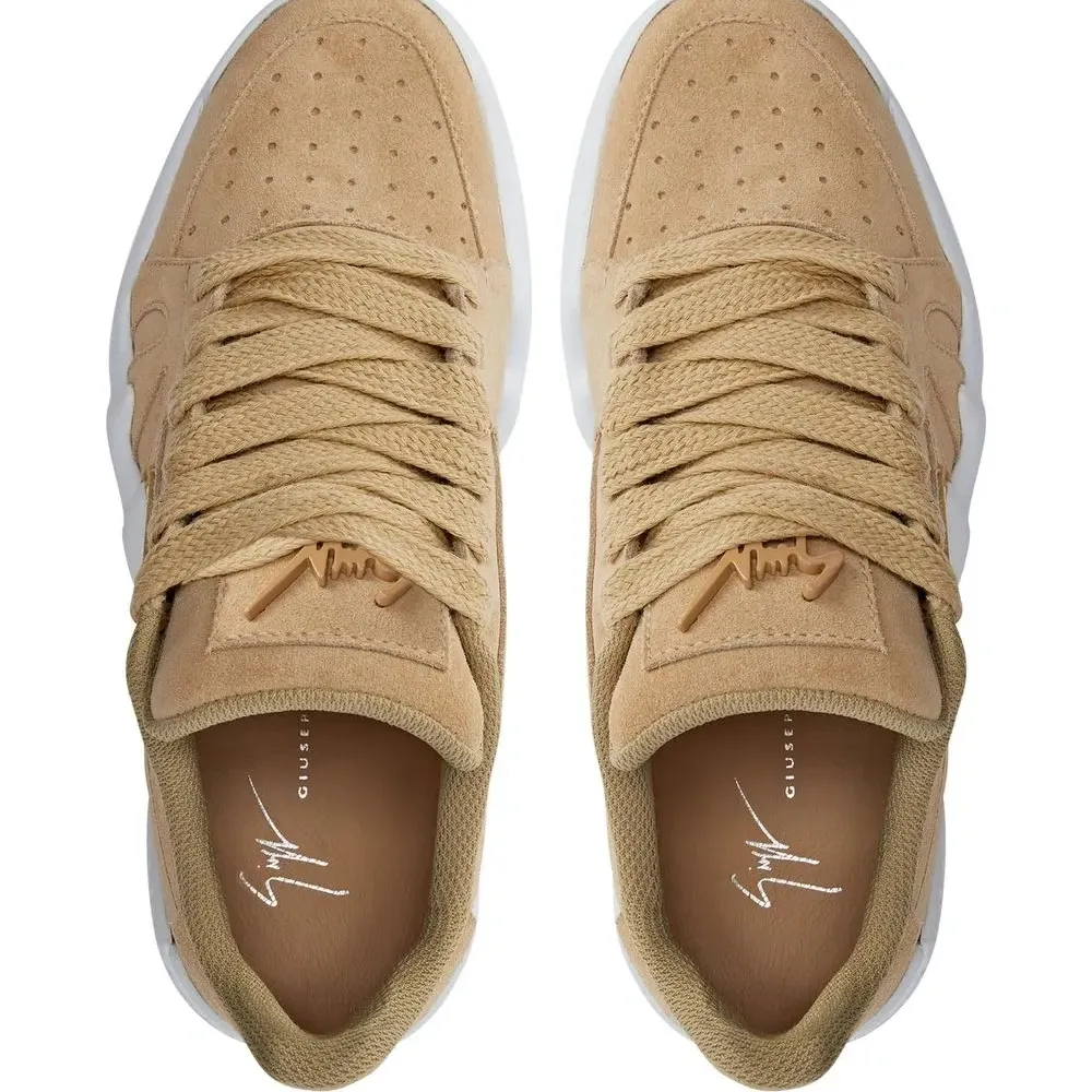 Бежевый, замша, фурнитура в тон, вставки, перфорированный носок, нашивка с логотипом сбоку, металлический логотип на язычке, стелька с логотипом, закругленный носок, шнуровка спереди и массивная резиновая подошва.