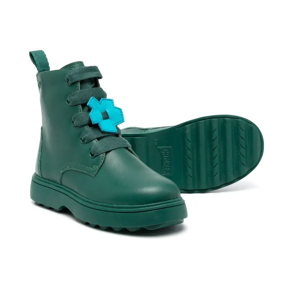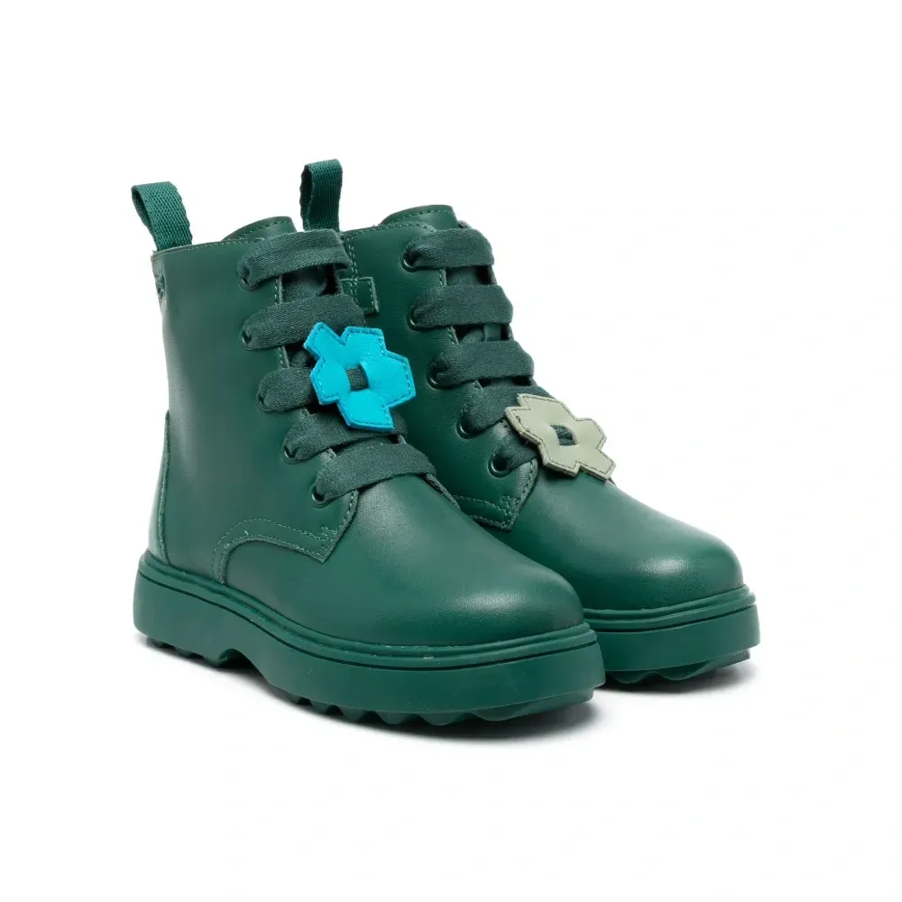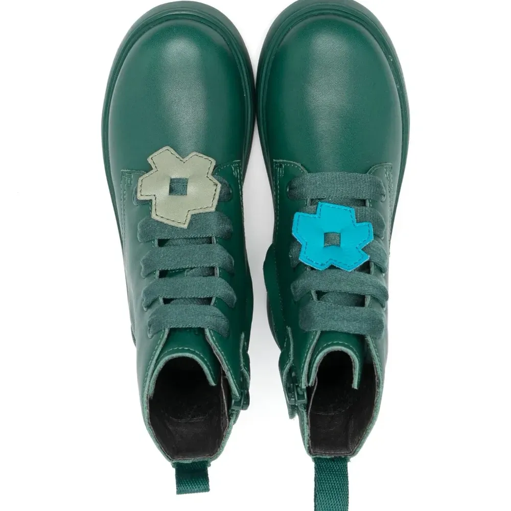Темно-зеленый, кожа, переработанный полиэстер, цветочная аппликация, петля для подтягивания сзади, закругленный носок, шнуровка спереди, застежка на молнии сбоку, стелька с логотипом и рифленая резиновая подошва. Кожа в составе этого товара сделана на фабрике, сертифицированной организациями Leather Working Group (LWG) или ICEC. Это гарантирует, что производитель минимизировал негативное влияние материала на окружающую среду. Узнать больше о том, какие товары получают отметку «Ответственный выбор», можно из материала «Как мы оцениваем экологичность и этичность».
