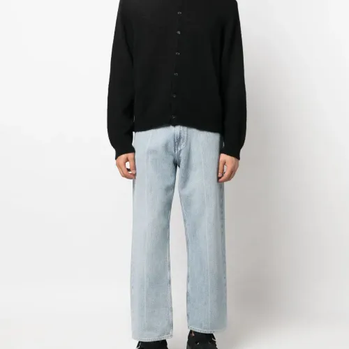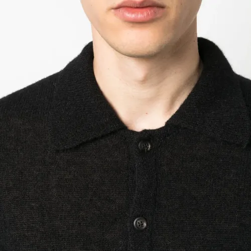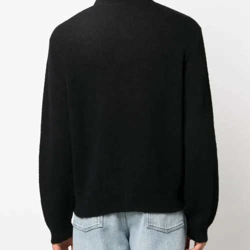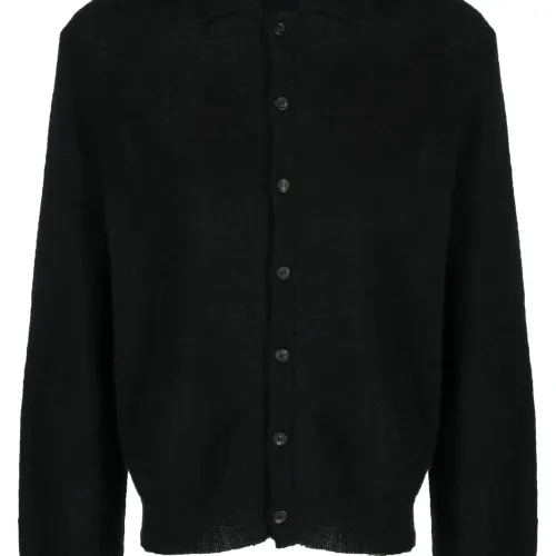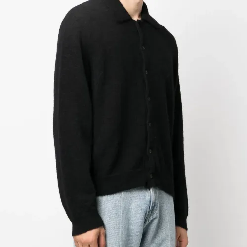 Черный, смесовая шерсть альпаки, трикотажный материал, плоский заостренный воротник, застежка на пуговицах спереди, длинные рукава и прямой подол.