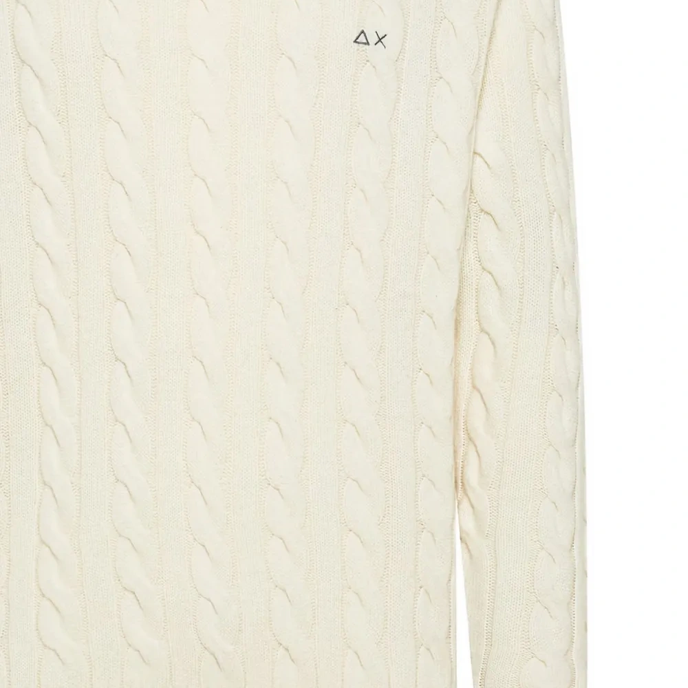 молочно-белый свитер с косами, воротником-гольф, длинными рукавами и логотипом