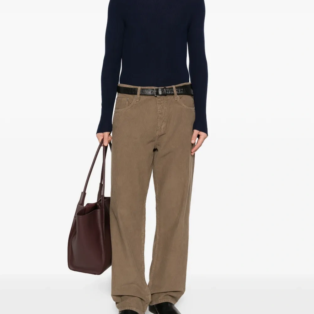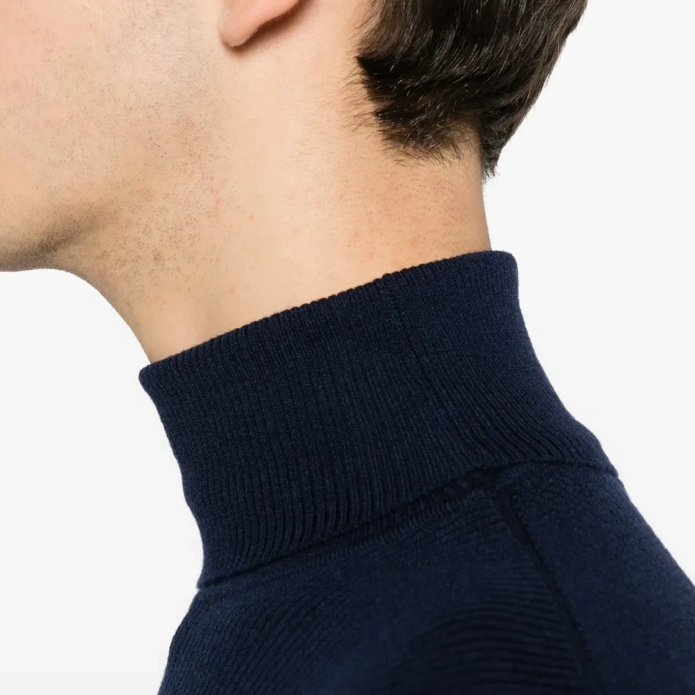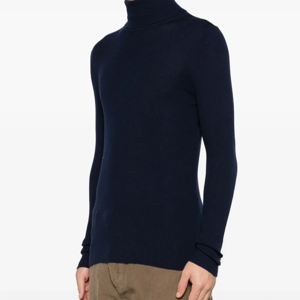 синий вязаный гольф в рубчик с длинными рукавами и прямым краем