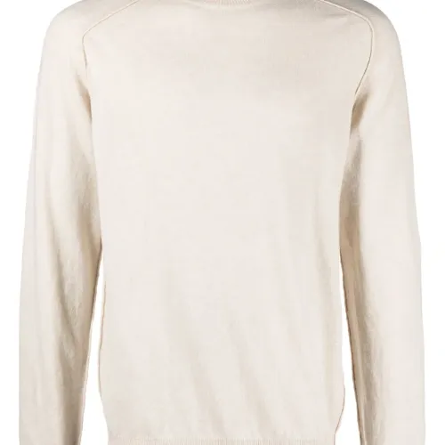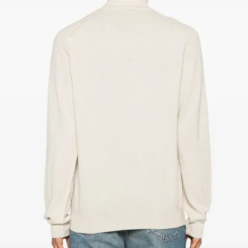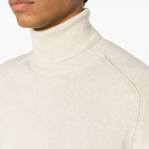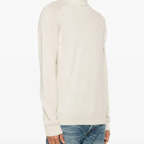 Экрю, смесовая шерсть мериноса, тонкая вязка, отделка в рубчик, высокий воротник, длинные рукава и прямой подол.