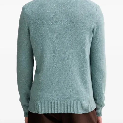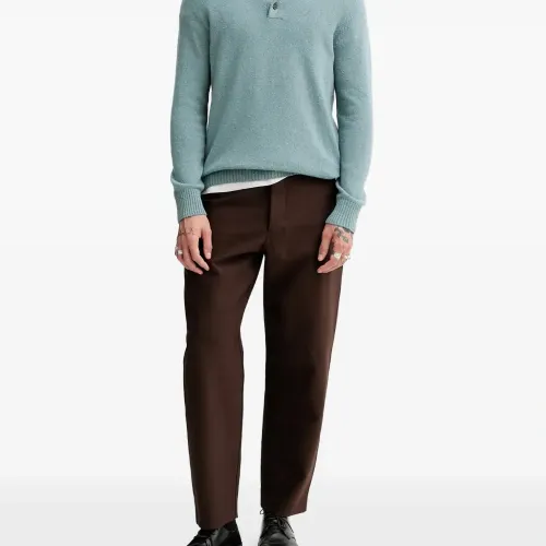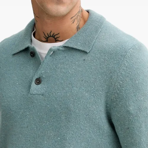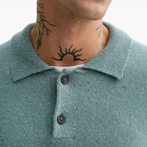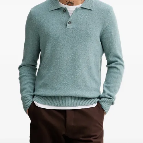 светло-голубой поло с застежкой на пуговицы, отложным воротником, длинными рукавами и ребристыми манжетами