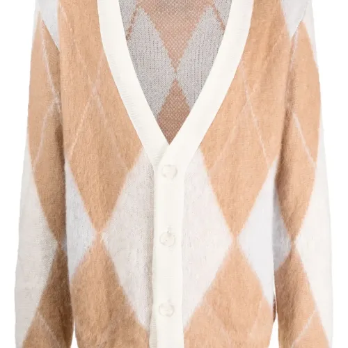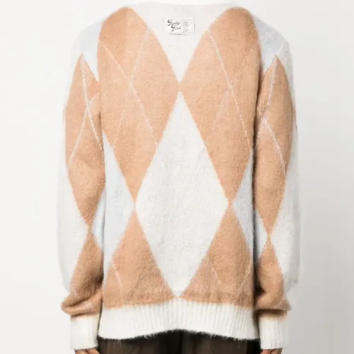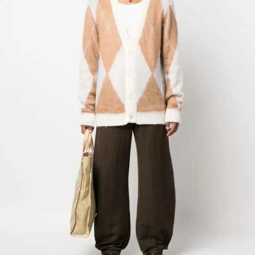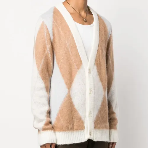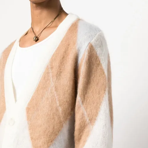 Миндальный, кремово-белый, смесь мохера и хлопка, матовый эффект, узор аргайл, V-образный вырез, нашивка с логотипом сзади, застежка на пуговицах спереди и длинные рукава.