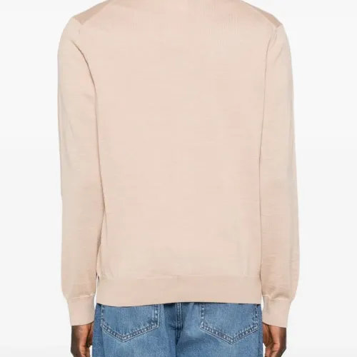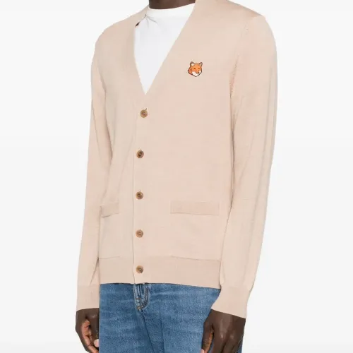 бежевый V-образный вырез, застежка на пуговицы, логотип, два накладных кармана спереди, ребристые края