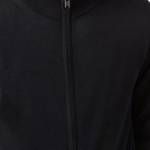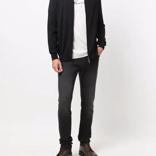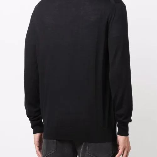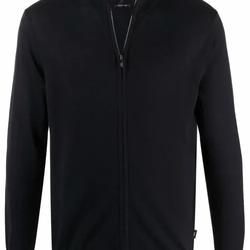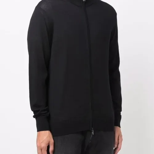 Тонкая вязка, высокий воротник, застежка на молнии спереди и длинные рукава.