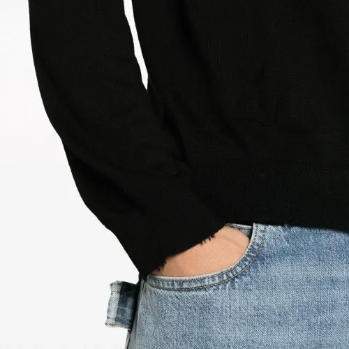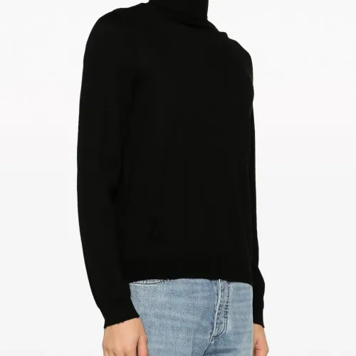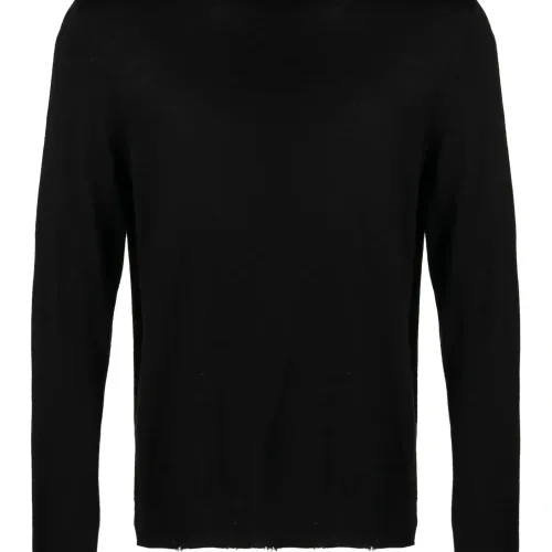 Черный, шерсть мериноса, ткань в мелкий рубчик, необработанные края, высокий воротник, длинные рукава и прямой подол. Это унисекс-модель. Обратите внимание, что для нее используется мужская размерная сетка.